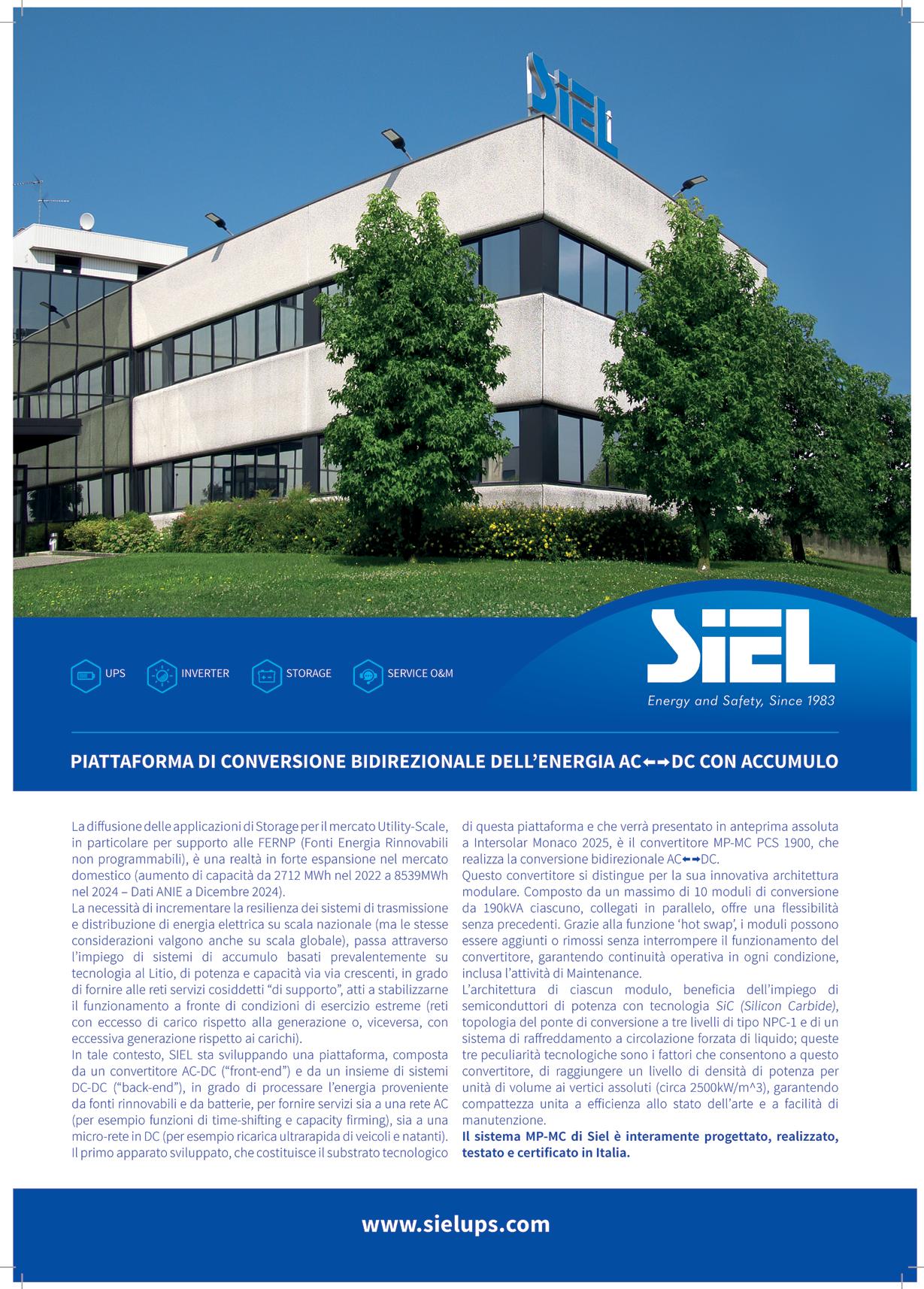 Siel presenta una soluzione di accumulo composta da un convertitore AC-DC (front-end) e da un insieme di sistemi DC-DC (back-end), in grado di processare l’energia proveniente da fonti rinnovabili e da batterie, per fornire servizi sia a una rete AC (per esempio funzioni di time-shifting e capacity firming), sia a una micro-rete in DC (per esempio ricarica ultrarapida di veicoli e natanti). Il primo apparato sviluppato, che costituisce il substrato tecnologico di questa piattaforma e che verrà presentato in anteprima assoluta a Intersolar Monaco 2025, è il convertitore MP-MC PCS 1900, che realizza la conversione bidirezionale AC-DC. Si tratta di un convertitore modulare costituito da un insieme di un massimo di 10 moduli di conversione da 190kVA ciascuno, connessi in parallelo tra loro, che possono essere rimossi dal o aggiunti al convertitore, mentre questo continua a funzionare (funzione “hot swap”). Il sistema MP-MC di Siel è interamente progettato, realizzato, testato e certificato in Italia.