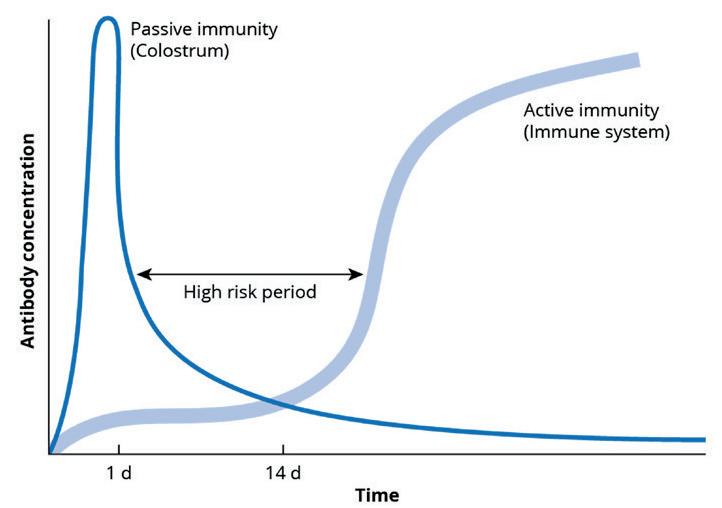 However, this leaves an immunity gap for calves when passive immunity tails off and acquired active immunity is slowly maturing, thereby leaving a ‘gap’ in their immune systems, typically day 7-14 (see Figure 1).