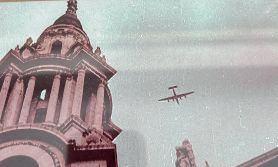 Aneurin’s plane flying past St Paul’s Cathedral in London following his last food drop mission.