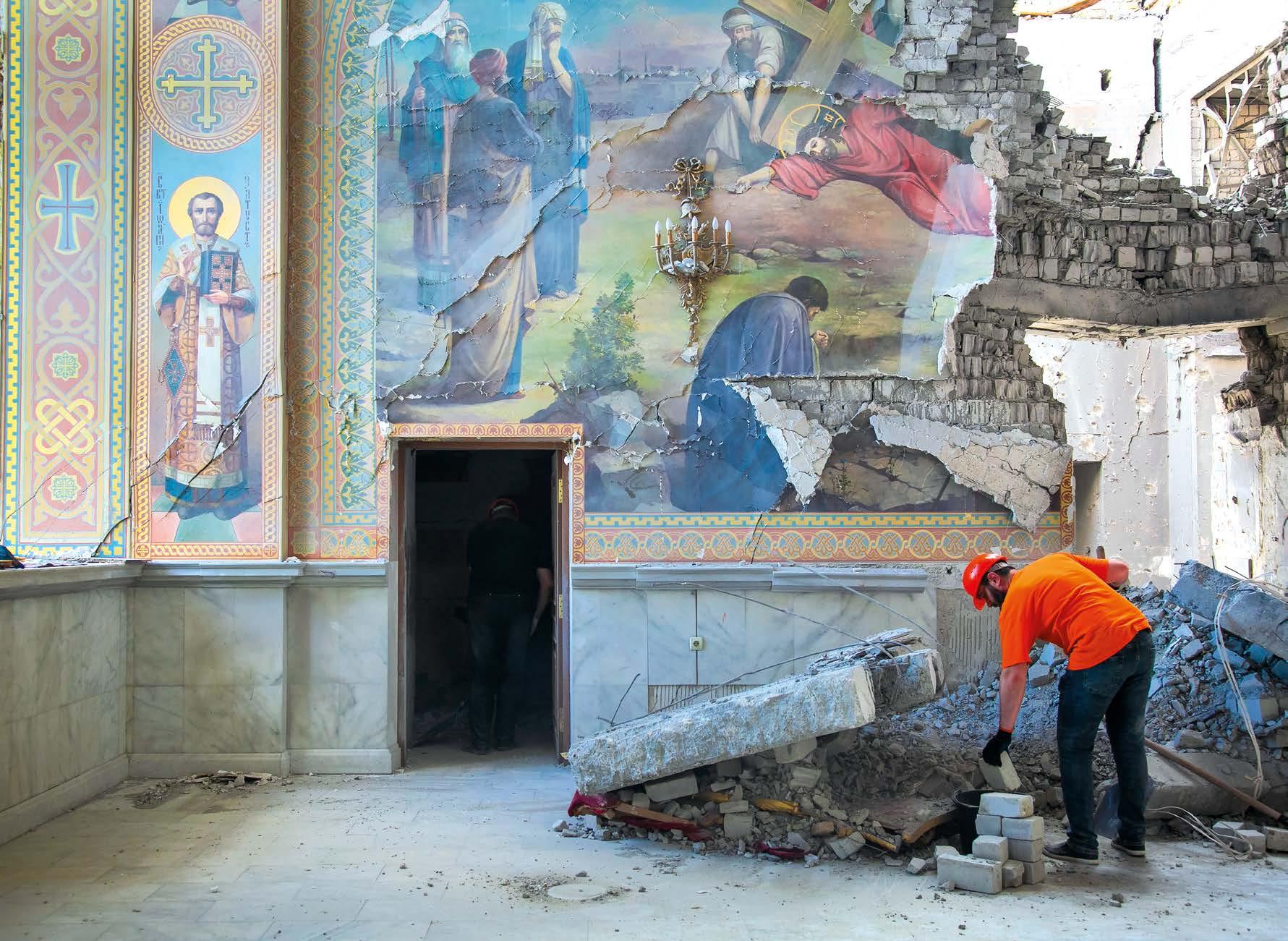 Restauratiewerkzaamheden in de Transfiguratiekathedraal in Odessa nadat die op 23 juli 2023 zwaar beschadigd werd door een Russische raketaanval.