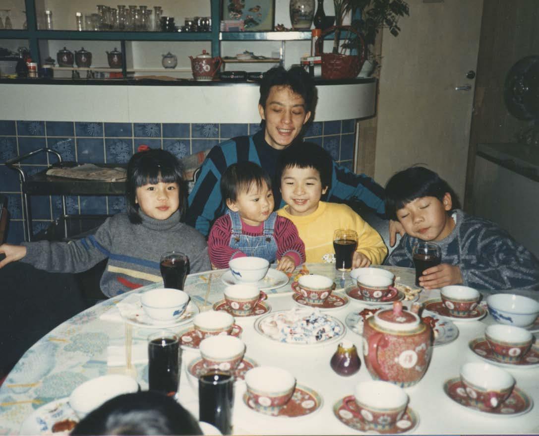 De twee zonen, Ngor Wai (David) Pang met kinderen uit de familie, samen aan tafel.