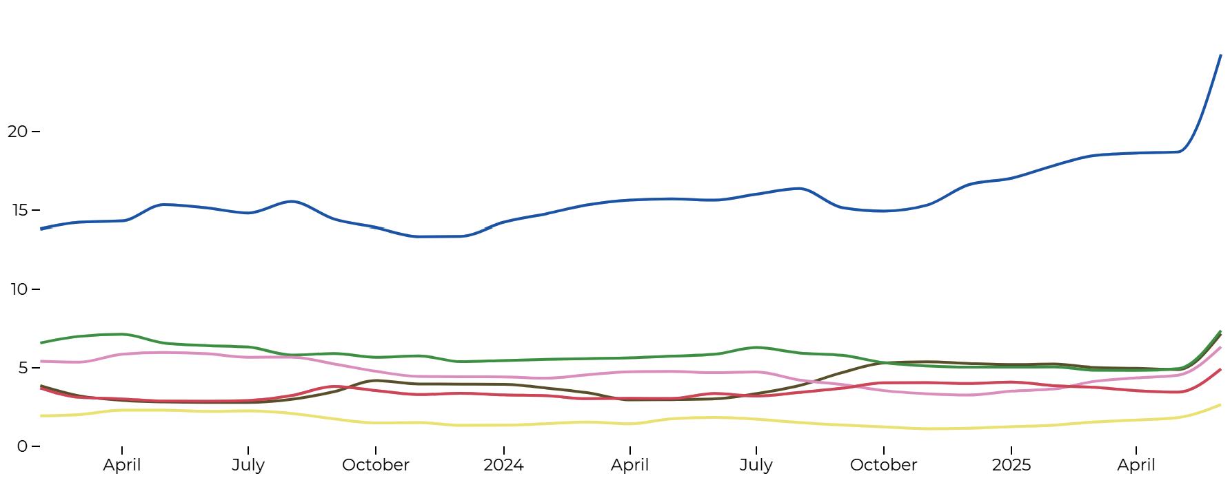 I grafici in queste pagine mostrano l’evoluzione delle tendenze di colori e stampe a livello globale negli ultimi due anni e mezzo, calcolate in base alla percentuale di ciascun colore o stampa all’interno dell’intera gamma globale