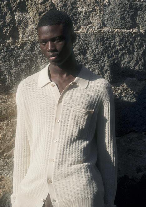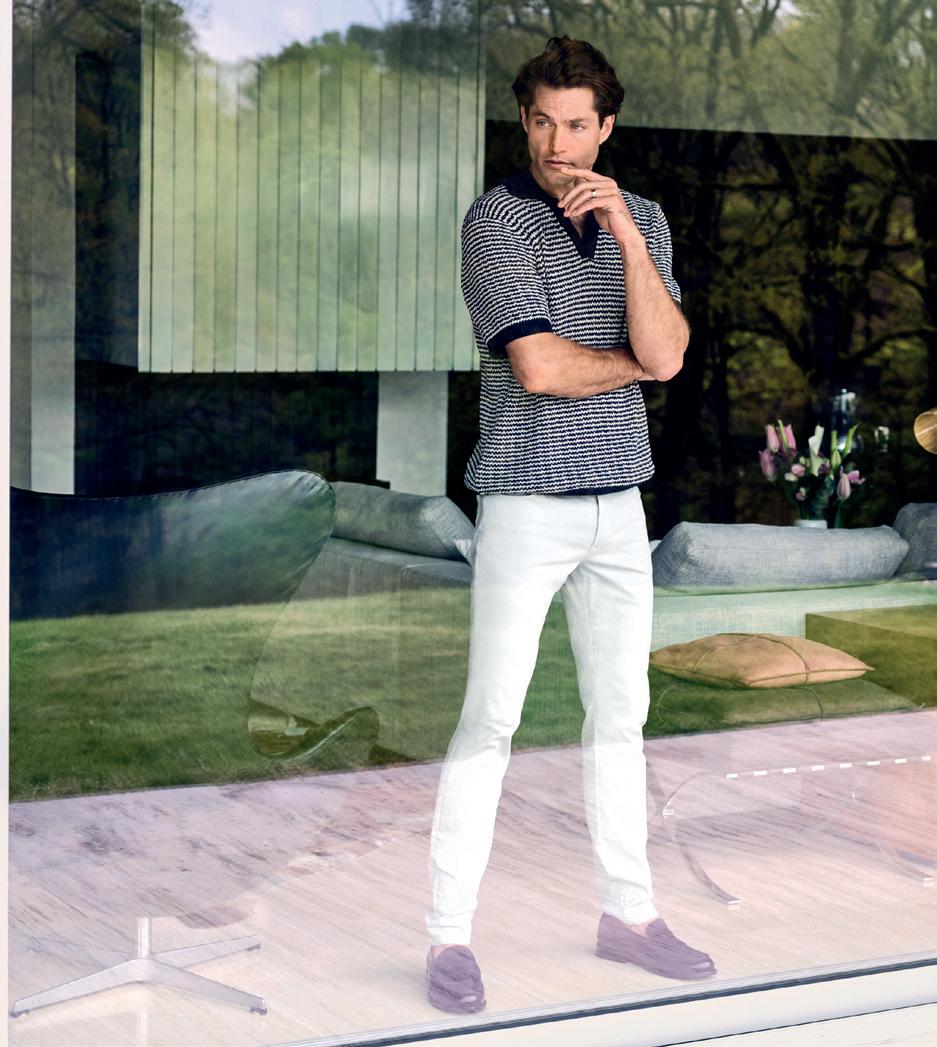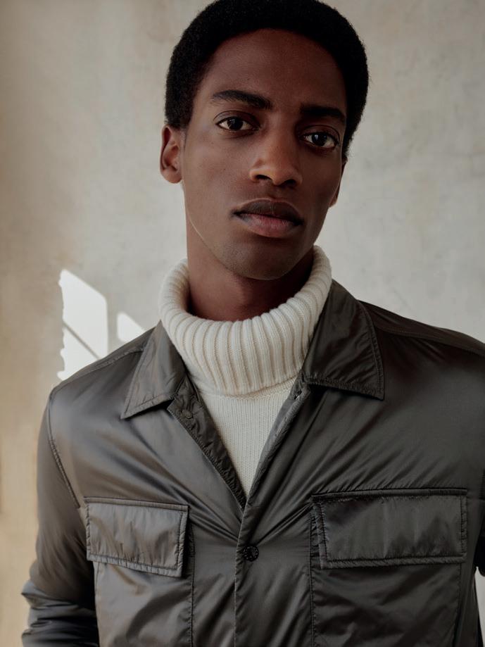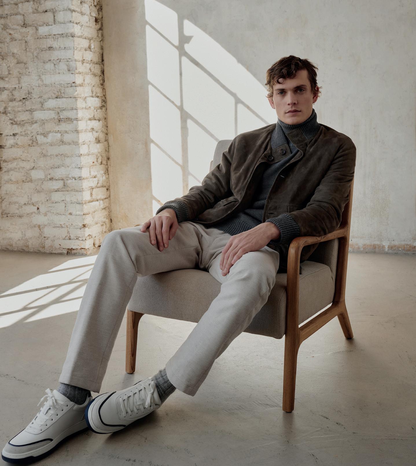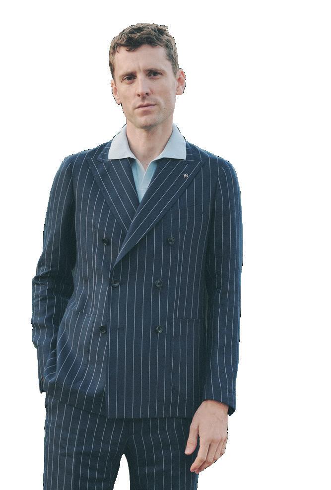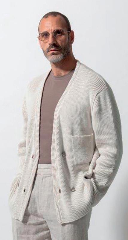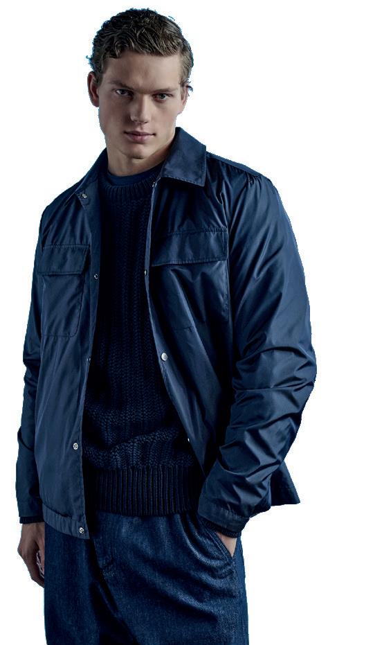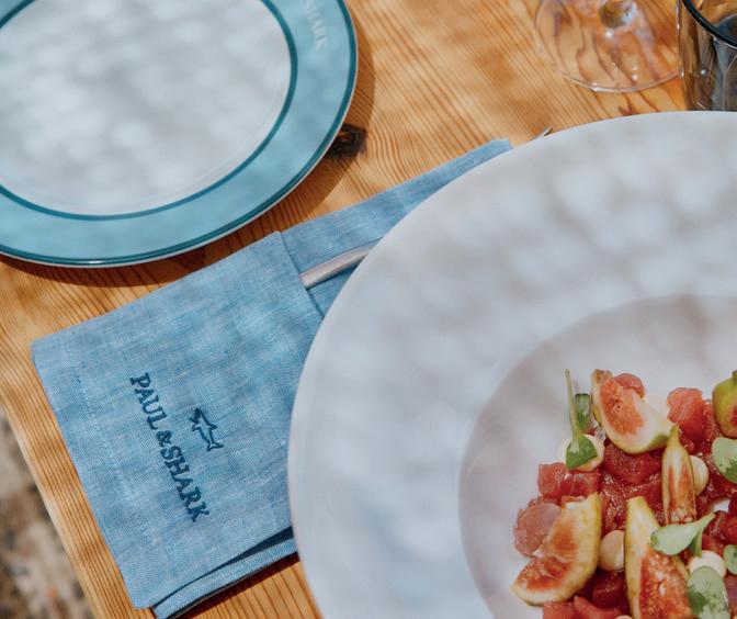 DI ANGELA TOVAZZINella pagina accanto, un ritratto di Andrea Dini, ceo della Dama, proprietaria del brand Paul & Shark, e terza generazione della famiglia. Capostipite fu Gian Ludovico Dini: il 4 marzo 1957 il Maglificio Dacò, fondato nel 1921, riprese le attività grazie al suo intervento. Nei primi anni Settanta Paolo Dini, il figlio maggiore di Gian Ludovico, durante un suo viaggio nel Maine si trovò per caso nel cortile di un velificio e il suo sguardo cadde su una vecchia vela da lavoro, che riportava la scritta "Paul & Shark". Da lì ebbe inizio l'avventura. In questa pagina, due immagini della collezione Riviera di Paul & Shark per la Fall-Winter 2024/2025