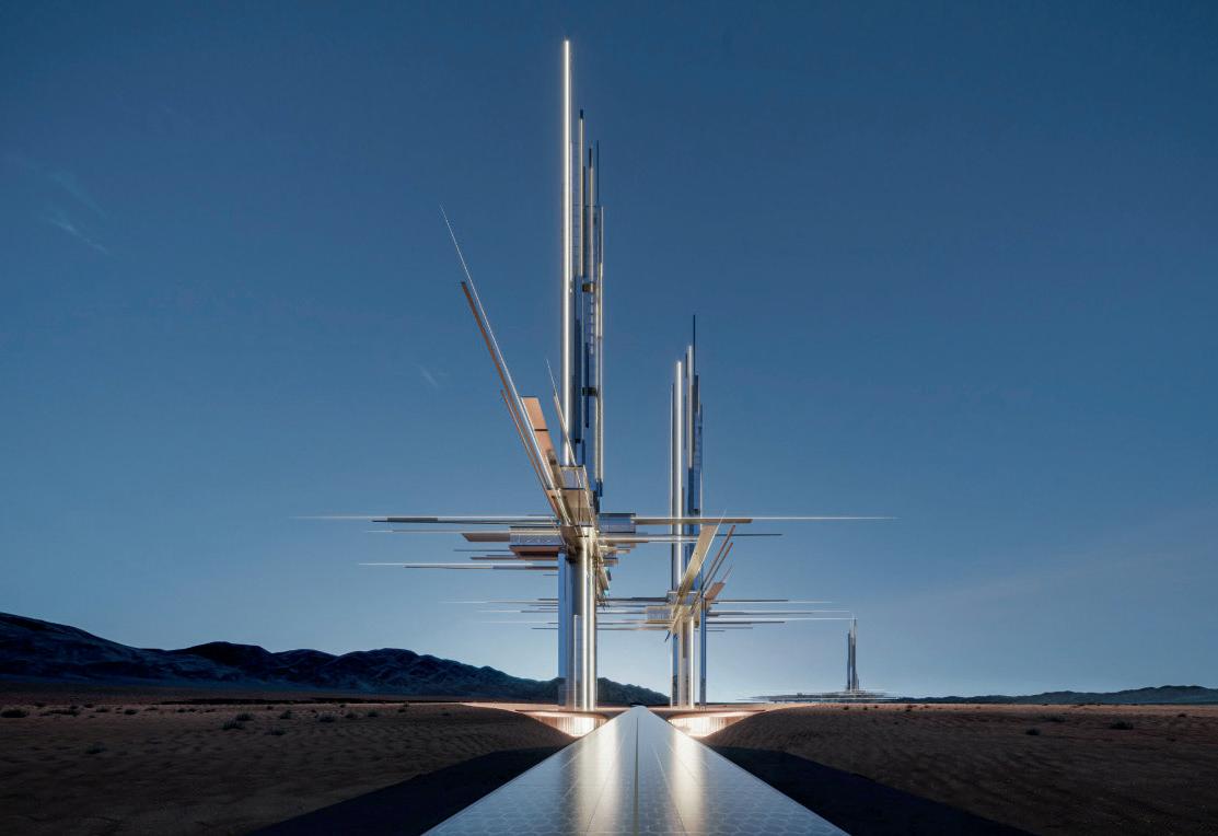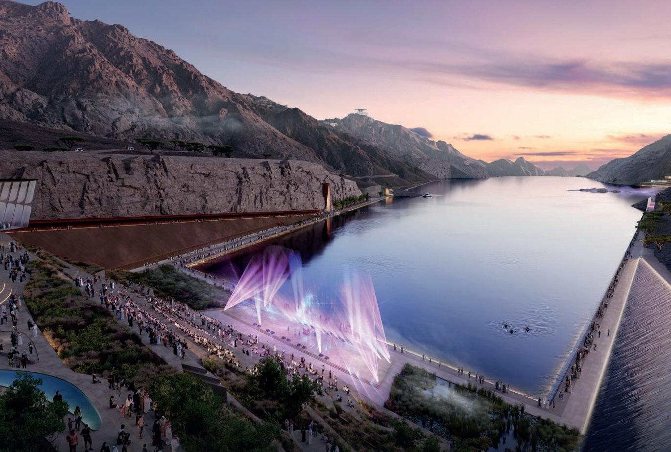1. Un rendering della città di New Murabba con, al centro, Mukaab, un edificio di 400 metri per lato che si candida a prima destinazione immersiva del globo 2. Il futuristico Epicon, sul Mar Rosso, progettato da 10Design, con due torri di 225 e 275 metri collegate da piattaforme che includono piscine, ristoranti, una biblioteca e una palestra 3. Il lago artificiale della futura stazione sciistica di Trojena, che dovrebbe essere ultimata per i Giochi