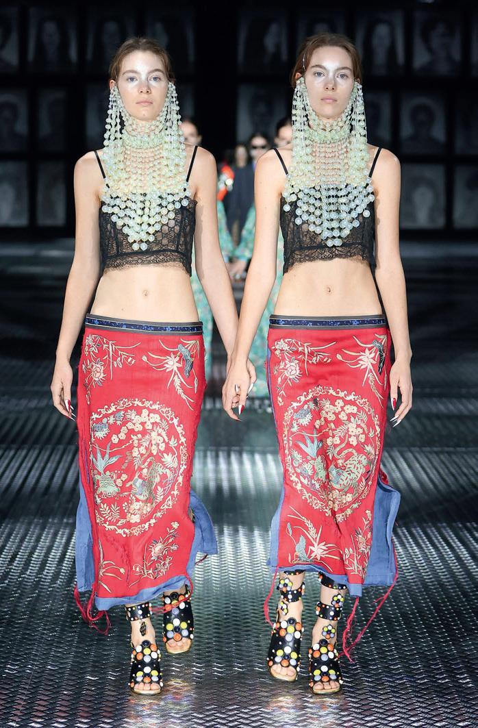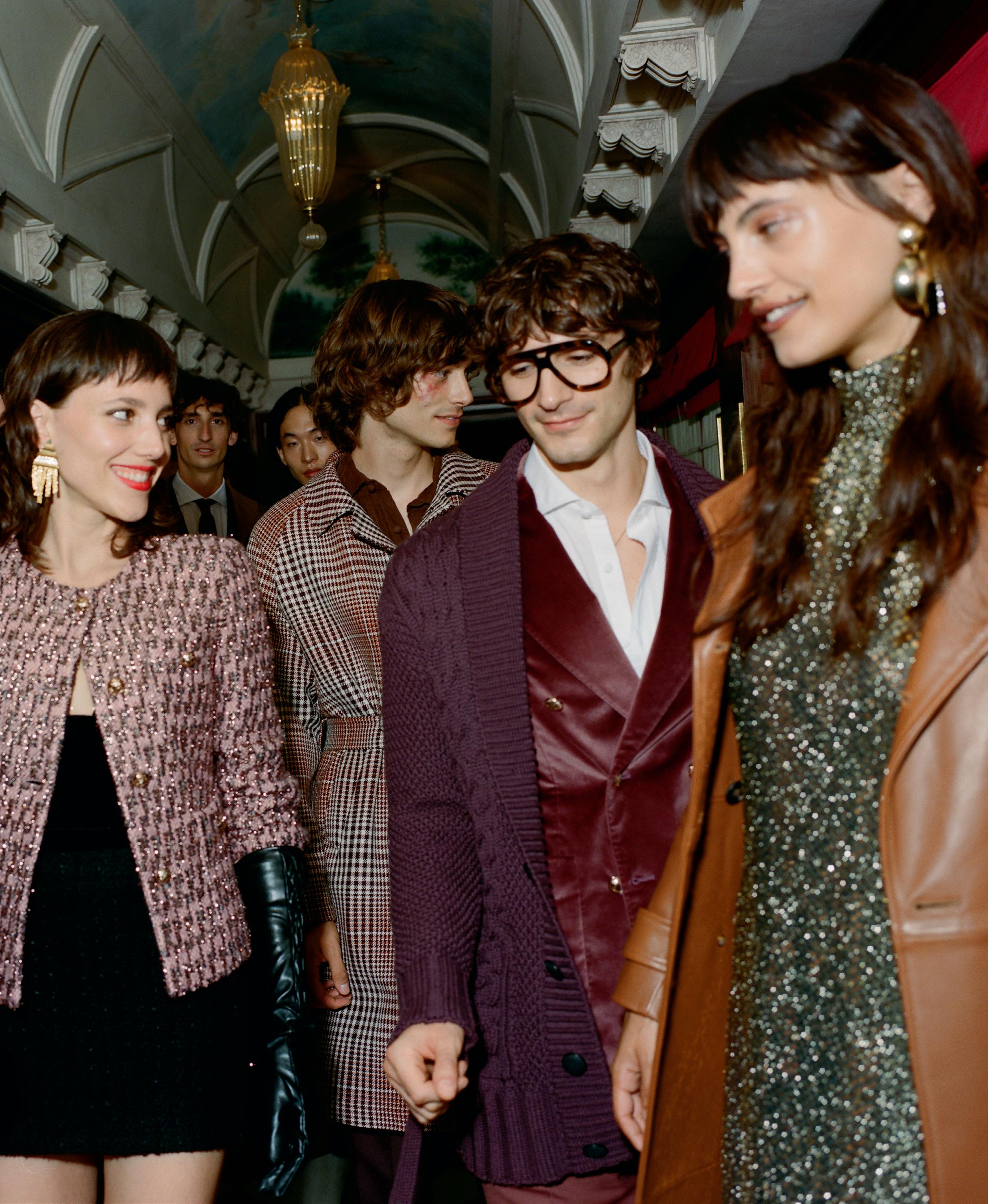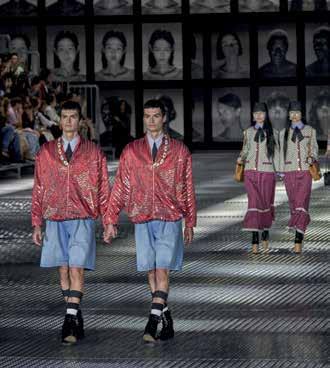 Alessandro Michele riflette sull’altro che vive dentro e fuori di noi. I vestiti si trasformano: i completi maschili perdono i pezzi, i tailleur femminili diventano corazze