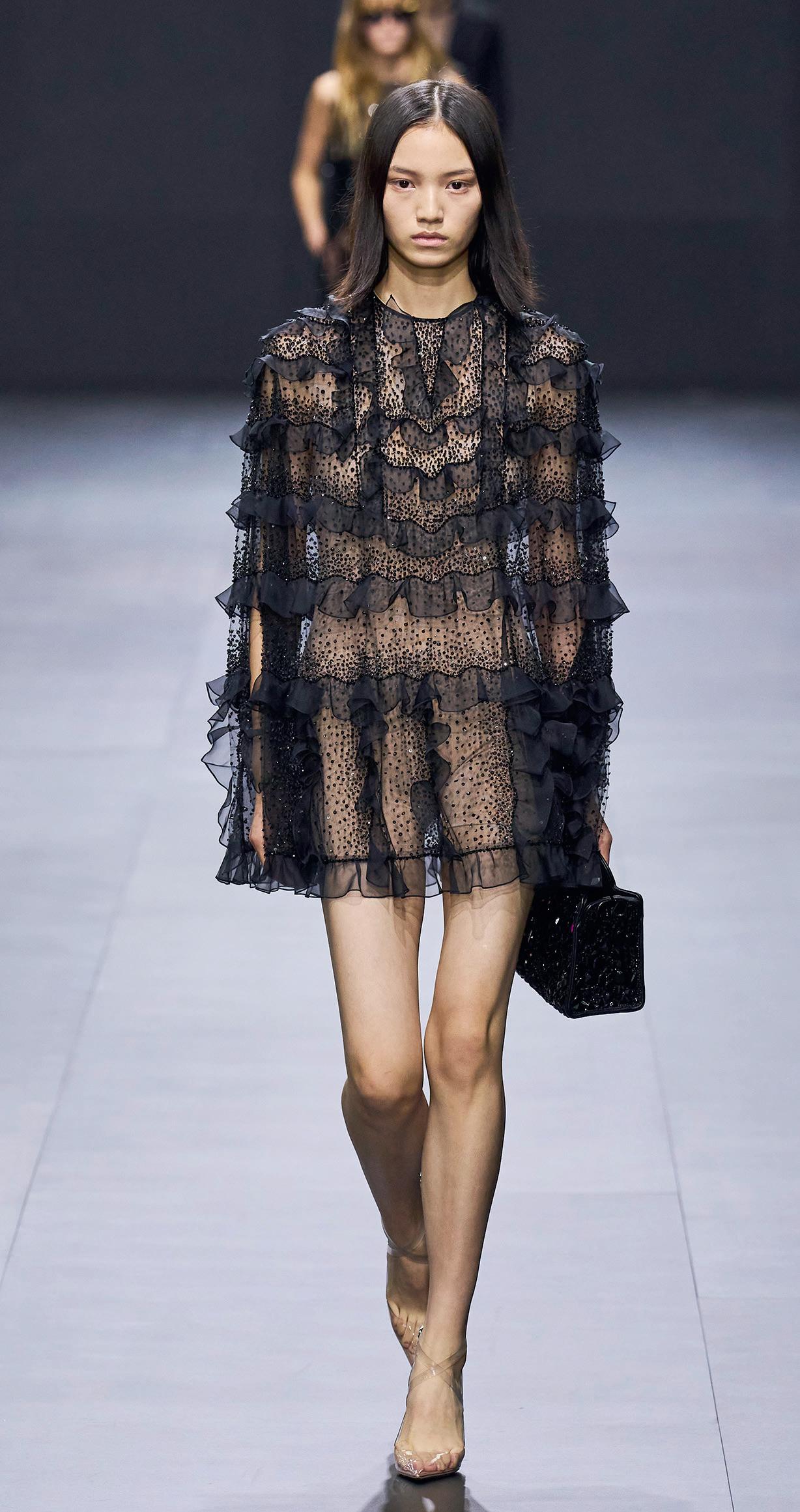 Come in un film in bianco e nero sfilano abiti metallizzati, maxi dress intarsiati di balze, jumpsuit in pelle a pois, gonne impalpabili.
