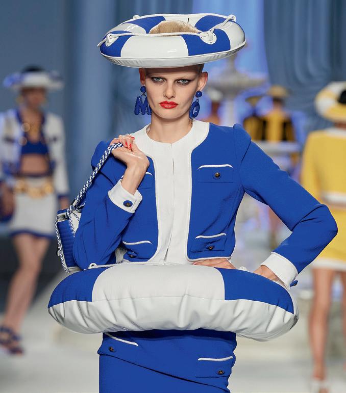 Jeremy Scott trasforma ancora una volta la moda in magia e ottimismo. I salvagenti gonfiabili diventano orli delle gonne dei tailleur, mentre dai materassini nascono mantelle e stole.