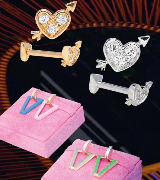 Sopra, il mono-orecchino Uali, che ha segnato il debutto della label: declinato in quattro colorazioni e poi arricchito di nuove gradazioni, è in argento 925 con placcatura in oro giallo o in platino e bagno di colore. Si arricchisce, nelle versioni luxury, di zirconi incastonati a mano. Più in alto, il piercing Juliet, in oro giallo o bianco 18 carati, con zirconi
