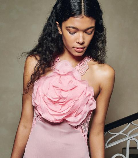 Dal gioco del fatto a mano scaturiscono abiti midi senza spalline in pelle impreziositi da rose scultoree, trench in satin e tailleur pantalone, arricchiti da paillette cangianti.