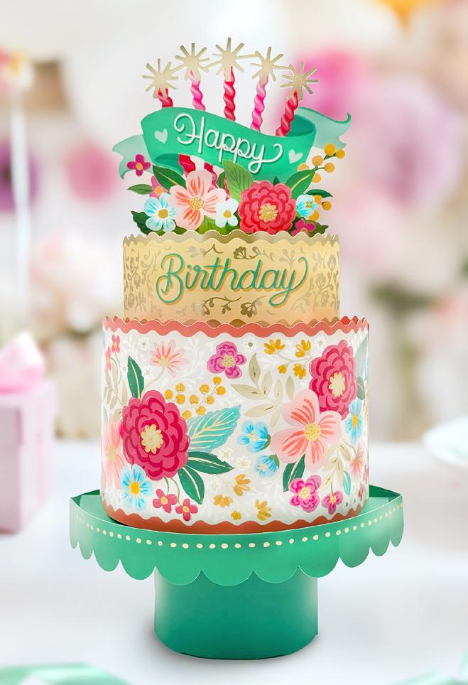 Celebrate their special day with our Blooming Birthday Cake! This gorgeous two tiered, gold foiled, floral delight is a festive and unique way to wish them well on their birthday. Pop-up and watch as this elegant display sparkles from all angles.