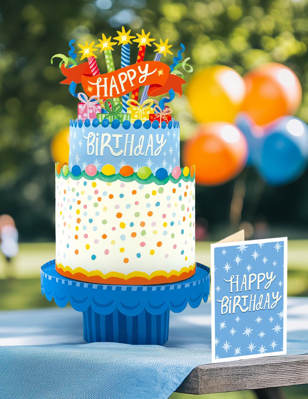 Cue the confetti! Celebrate their big day with our vivid and playful two tiered paper confection. A festive and fun way to wish them well on their birthday.