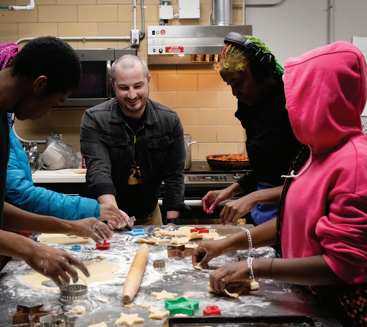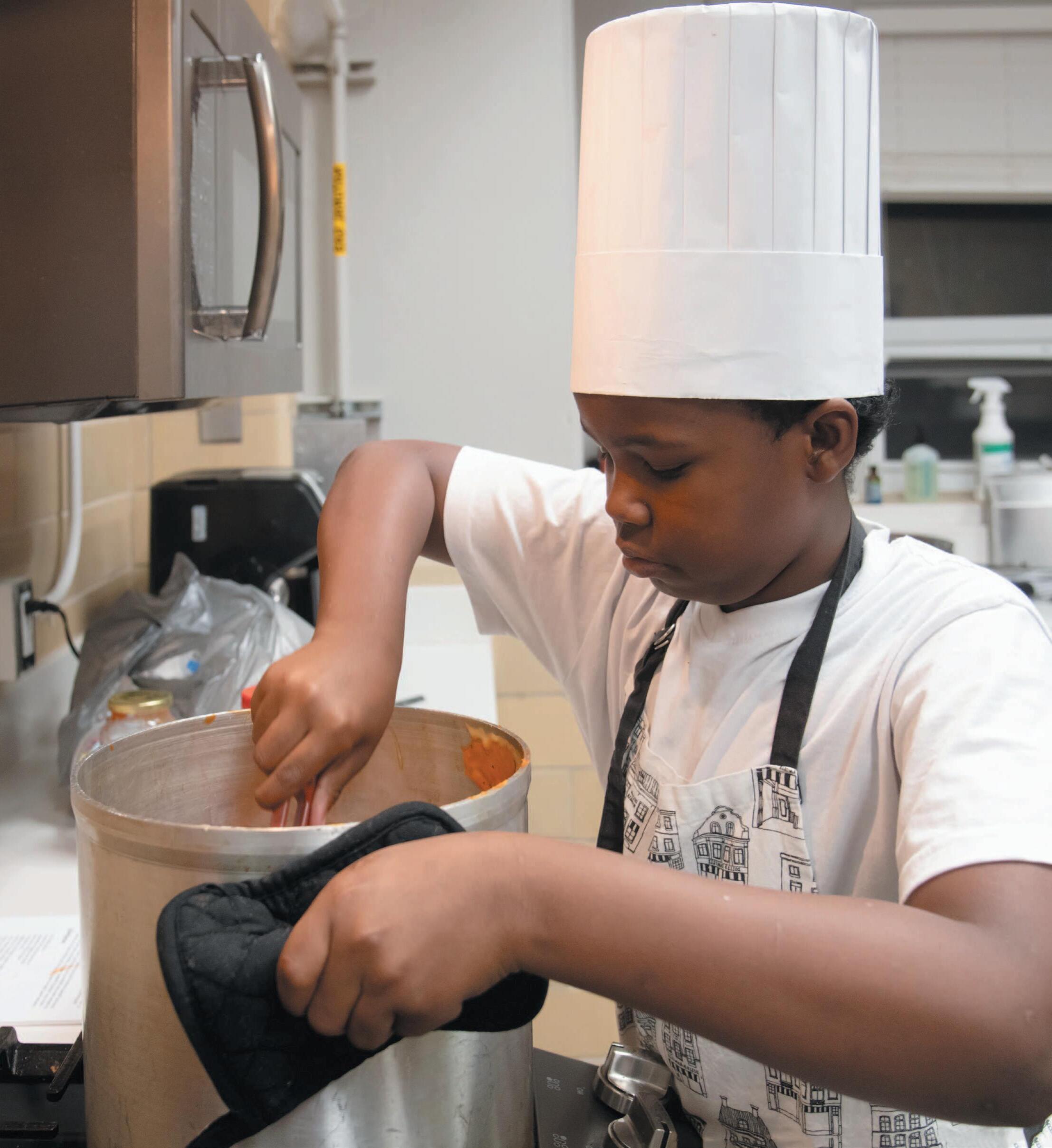 informative. “We try to make the food very hands-on, but I still want any skill level to be able to participate,” Lynch says. “What we’ve learned in the past few months is that kids really like elaborate desserts. They love focusing on making things pretty. We made fruit pizza recently, and the amount of energy and art they put into it was incredible.”