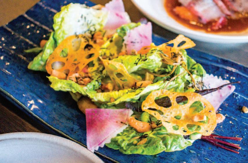 At a restaurant known for its incredible treatment of fish, Sado’s miso ginger salad might be the most inventive thing on the menu. It’s a gastronomic mixture of gem lettuce, candied cashews, lotus root and sugar snap peas dressed in a bright and umami-laden dressing served over a jalapeño edamame purée.