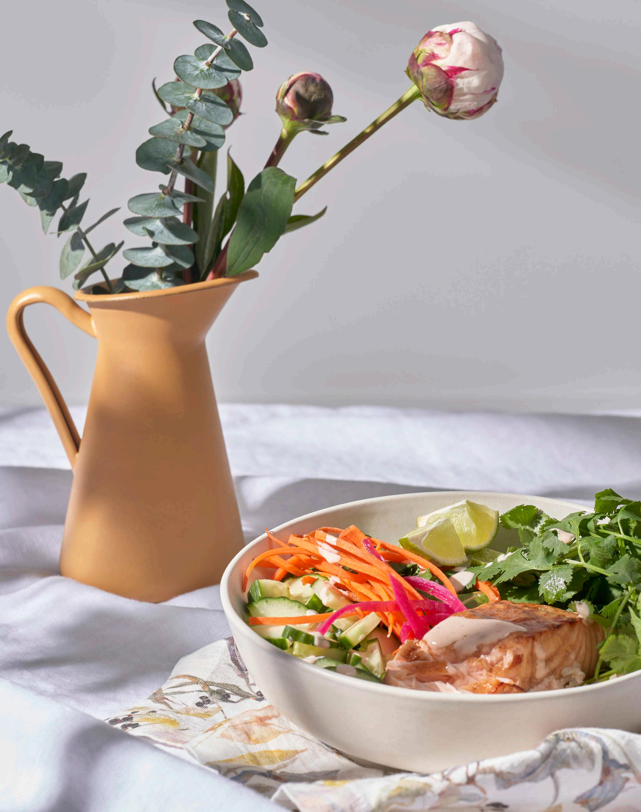 Remove and let cool slightly as you prepare the bowls. Divide warm rice into shallow, wide bowls and add salmon filet to each. Divide vegetables over top of rice as desired, starting with kale, cucumber and carrots and ending with pickled onion and cilantro leaves.