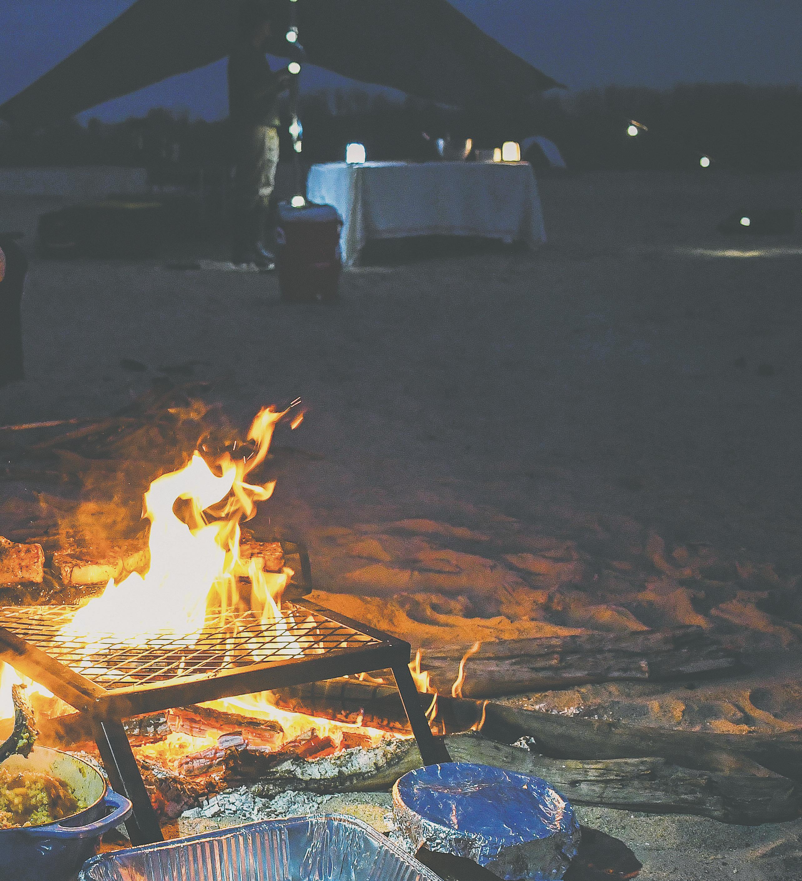 The dinner Fordyce serves on this particular night perhaps best encapsulates both her philosophy of using local ingredients and the magic of her dinner theater. The farro risotto, with chestnuts and oyster mushrooms she foraged from her father’s land, is creamy and nutty with an earthy lightness that makes you want to rush for another scoop. Before the trip, Fordyce sous-vides pork chops with lemon and herbs – a technique that allows her to fully cook the pork chops and house them in a cooler to grill over the fire later. Although easier and faster in terms of preparation,