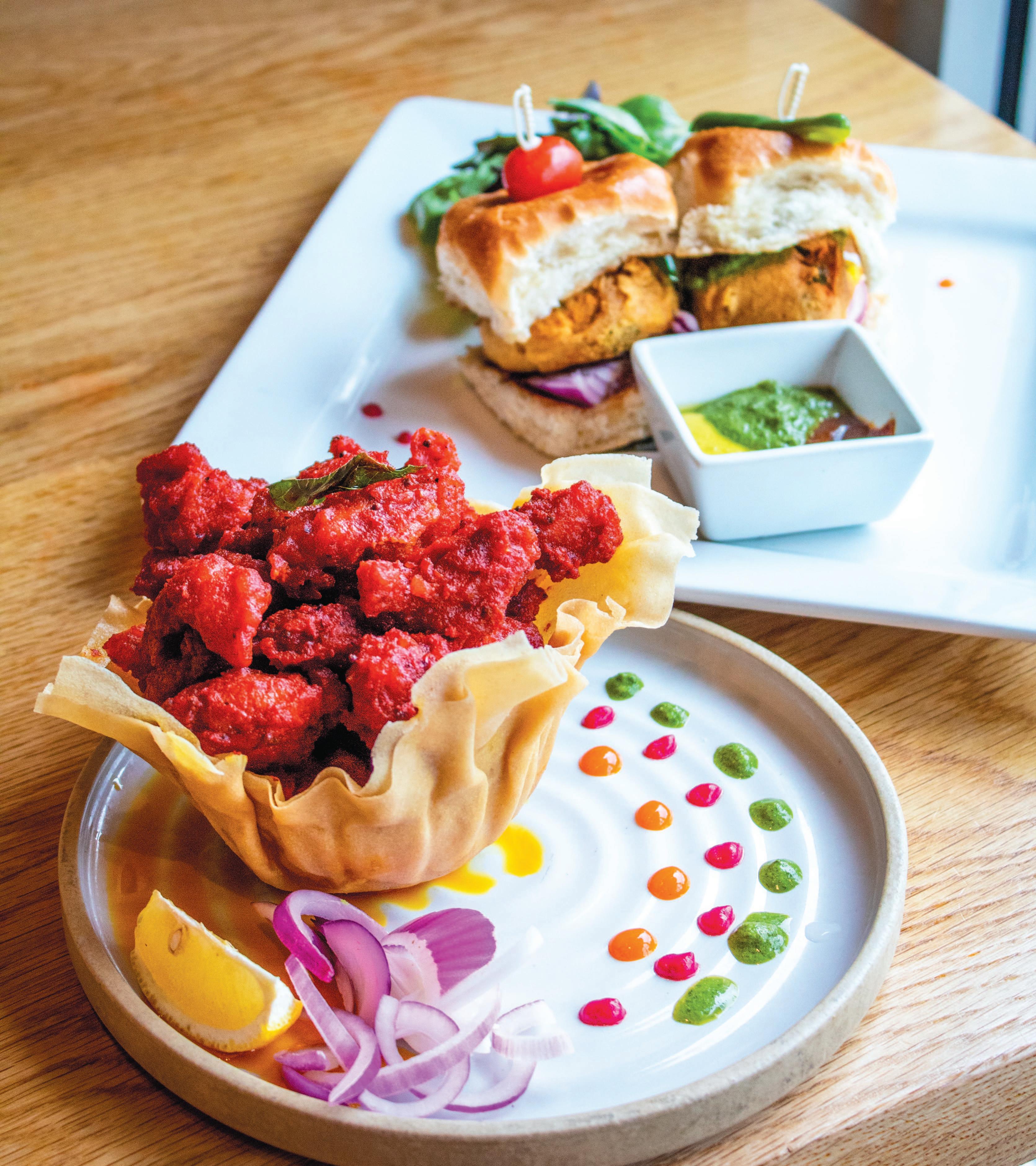 Turmeric prioritizes a modern plating approach to pair with their innovative menu, which makes for an altogether “posh” vibe, as Dayal calls it. For example, the Turmeric sampler platter’s five items are served on a long platter, and the chefs make designs with the sauces they include. “The whole thing is appealing,” Dayal says. “If it looks good, then you feel good about it when you first taste it.”