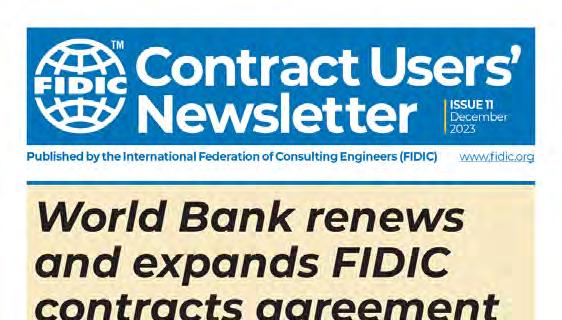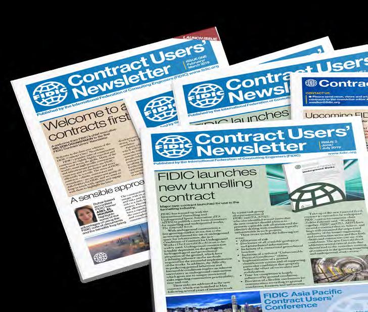 • Contract Users’ Newsletter: The FIDIC contracts committee contributes to the development and publication of the regular FIDIC Contract Users’ Newsletter. This newsletter delivers updates, technical articles, guidance and customised advice related to FIDIC contracts. It offers both tailored content for specific events and broader messages for the entire FIDIC membership.