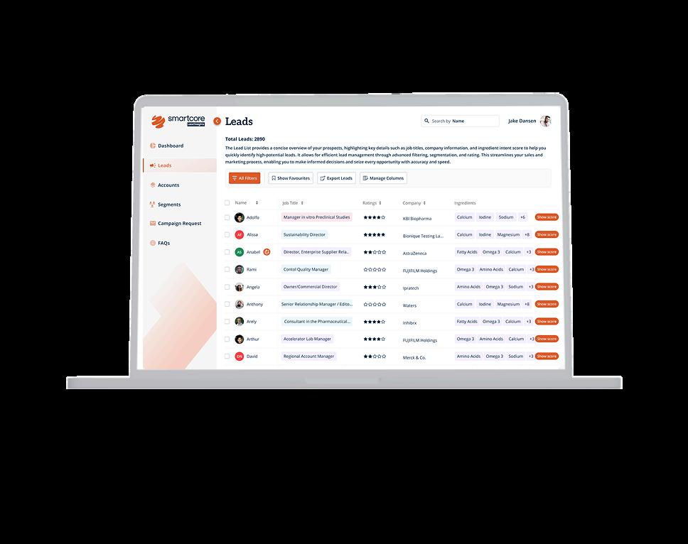 SpecificallybuiltforVitafoodsEuropeexhibitors,Smartcore LeadInsightsistheonlyAI-poweredleadintelligence platformthatleveragesuniquehigh-qualitydataand signalsofthenutraceuticalindustrytoincreaseefficiencies ofyoursaleseffortsandmarketingcampaigns.