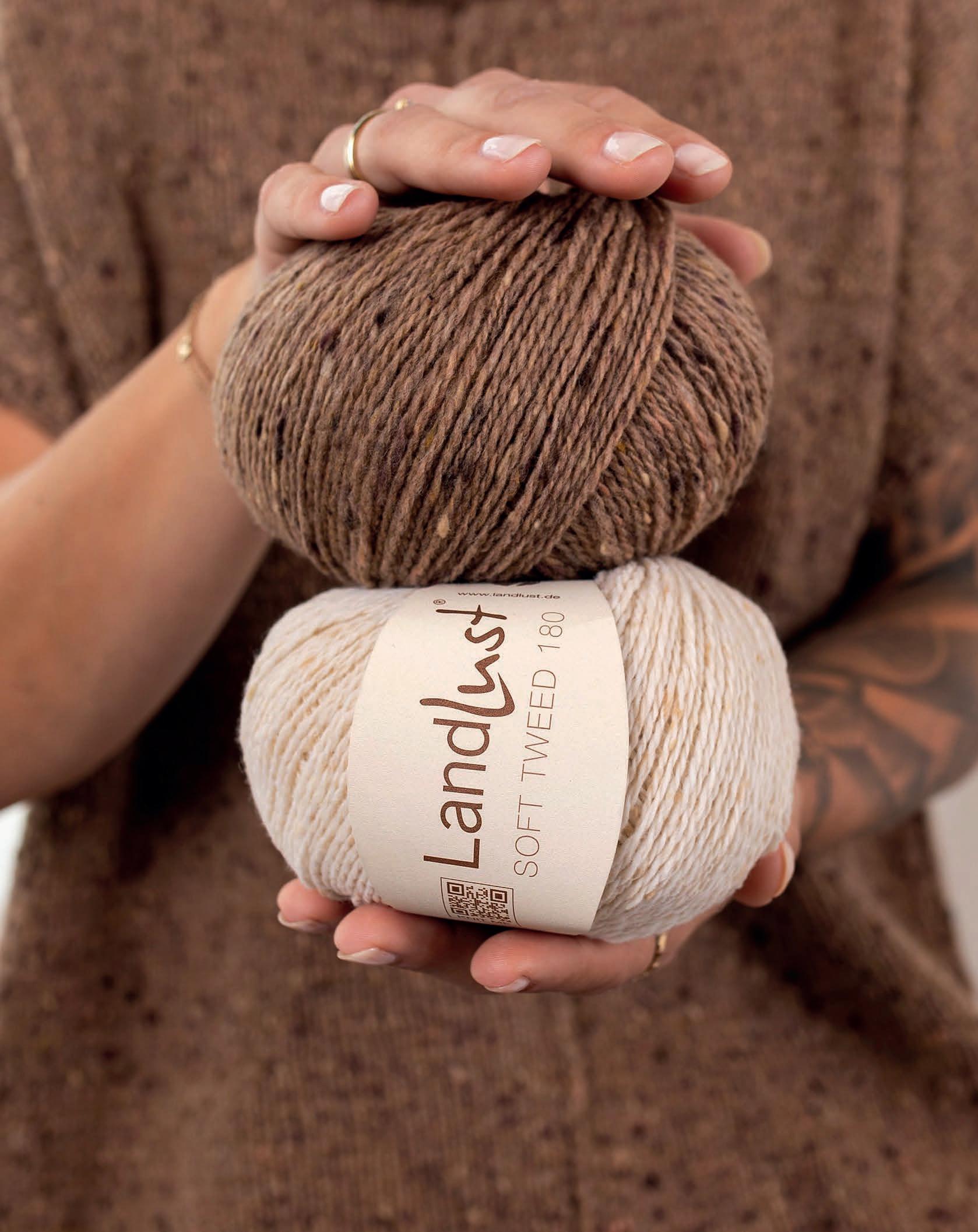 Für diesen rustikal, genialen Strick sorgt das klassisch verzwirnte TweedGarn Landlust Soft Tweed 90. Die Kombination aus reiner Schurwolle (Merino) und mehrfarbigen Noppen verleiht der Jacke ihren ländlichen, natürlichen Look.