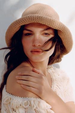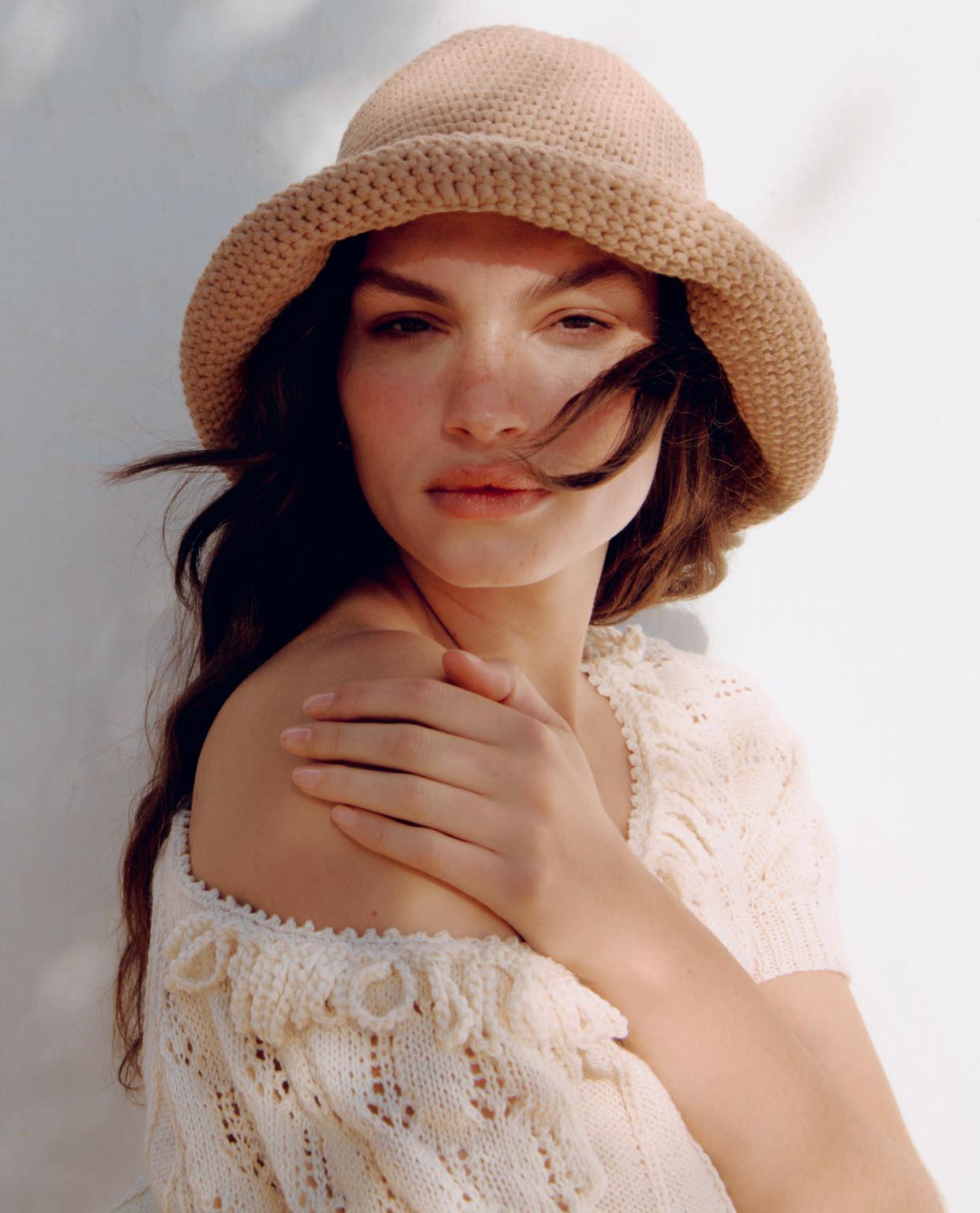 06 | 07 – HUT und PULLI Garnneuling „The Fine Tube“ verpasst dem gehäkelten Schlapphut Stand und Struktur. Dazu gibt es einen kleinen, detailreichen Strick-Pulli mit Ajourmuster, Hebemaschenstreifen und Luftmaschenschlingen am Carmen-Ausschnitt. THE FINE TUBE | COTTON WOOL