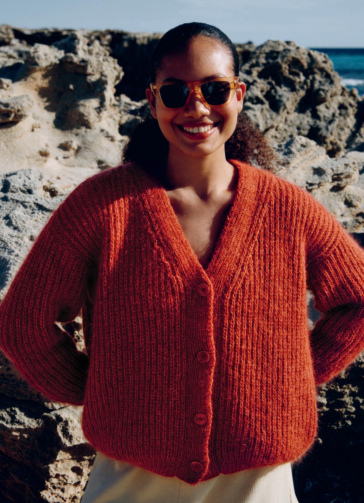 27 – CARDIGAN Der doppelfädig gestrickte Halbpatent-Cardigan schmeichelt mit einer Mischung aus Orange und Ziegelrot. Er hat eine anfängerfreundliche Form. Praktisch: Durch seine Qualitäten (seidiges Flauschgarn und ein neues, feines Merinogemisch) begleitet er Sie auch im Winter. COTTON WOOL + SILKHAIR