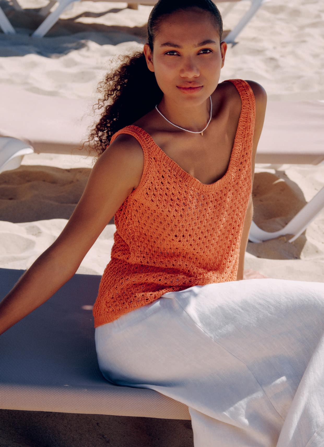 25 – TANKTOP Leinengarn in Lachsorange, ein netzartiges Lochmuster und eine leicht verlängerte Silhouette: Die Deluxe-Version des klassischen Tanktops – hier cool inszeniert, mit einem schlichten Midi-Rock in Weiß. SOLO LINO