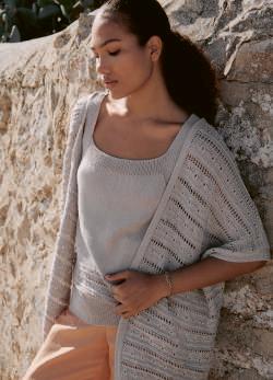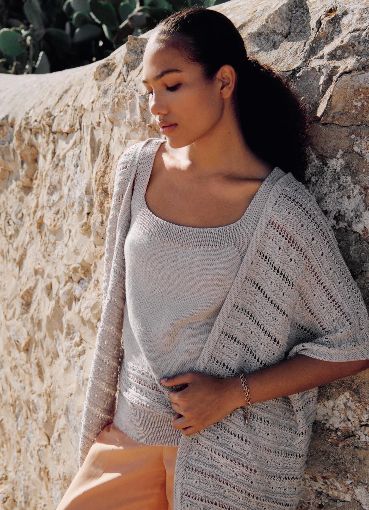 30 | 31 – TOP und JACKE Entspannt statt steif – so sieht das neue Twinset aus. Basis hier ist ein Top in leichter Trapezform und mit Karree-Dekolletees in Vorder- und Rückenteil. Die angestrickten Hebemaschen-Träger verschmelzen mit den Ausschnittblenden und kreieren so einen schlichten, hochwertigen Look. Den Saum betonen zweierlei Lochmuster, die in der schenkellangen Jacke wieder aufgegriffen werden. COTTON WOOL