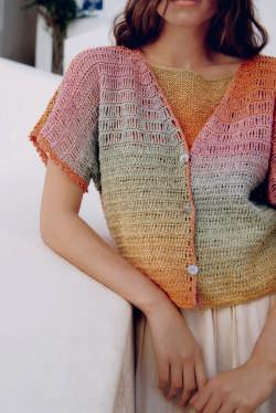 | 02 – TOP und JACKE Das leichte, kraus rechts gestrickte Kasten-Top beindruckt mit einem weichen Verlauf aus pudrigen Tönen und kräftigem Orange. Dazu gibt es ein passendes Häkel-Jäckchen, das mit Pikot-Rändern akzentuiert wurde. MARE
