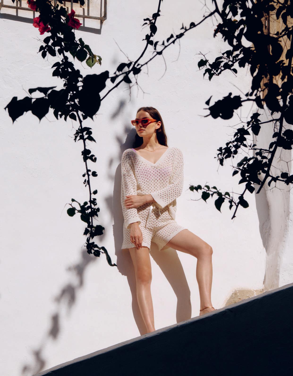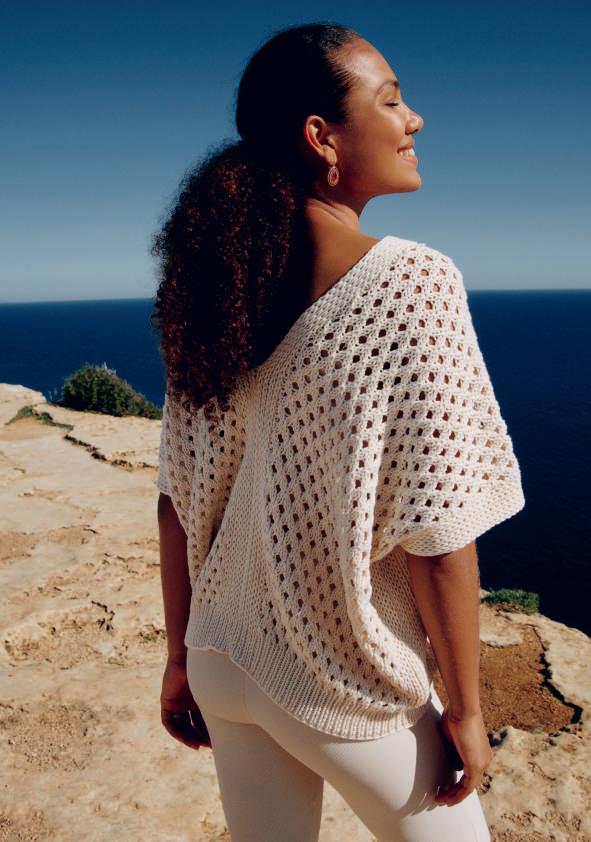 PULLOVER und SHORTS Beim cremefarbenen Set im grafischen Häkelmuster sorgt ein neues Bändchengarn für Leichtigkeit und einen dezenten Glow. Der Pulli wird bis zu den Armausschnitten in Runden gearbeitet. Die Shorts haben eine hohe Taille mit Tunnelzug, die nach Belieben reguliert werden kann. NASTRINO