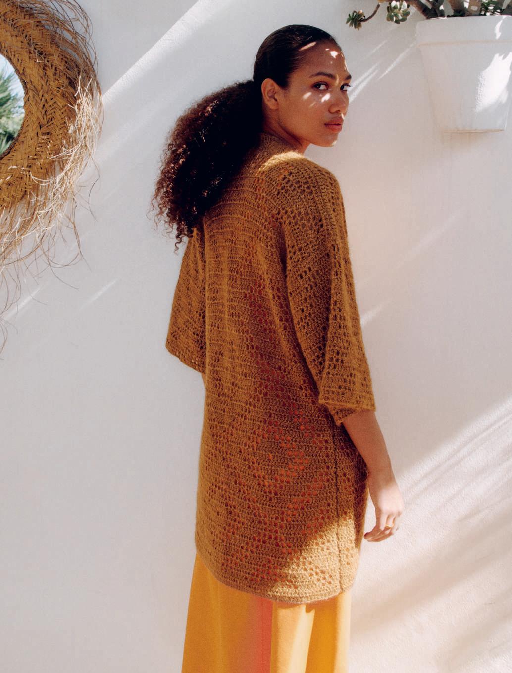 17 – CARDIGAN Beim Cardigan in Ocker/Nougat wurden Bändchen- und feines Flauschgarn zusammen verhäkelt. Das grafische, durchbrochene Muster bringt Abwechslung und Leichtigkeit in die gerade Oversize-Silhouette. NASTRINO + SILKHAIR