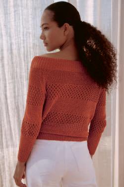 21 – PULLOVER Dieser zeitlose Pullover wird glatt rechts und im Lochmuster gestrickt. Highlight ist sein Carmen-Ausschnitt mit breiter, stabiler Rippenblende. Abgerundet wird das Luxusteilchen durch ein neues, schwereloses Bändchengarn in schimmerndem Terrakotta. NASTRINO