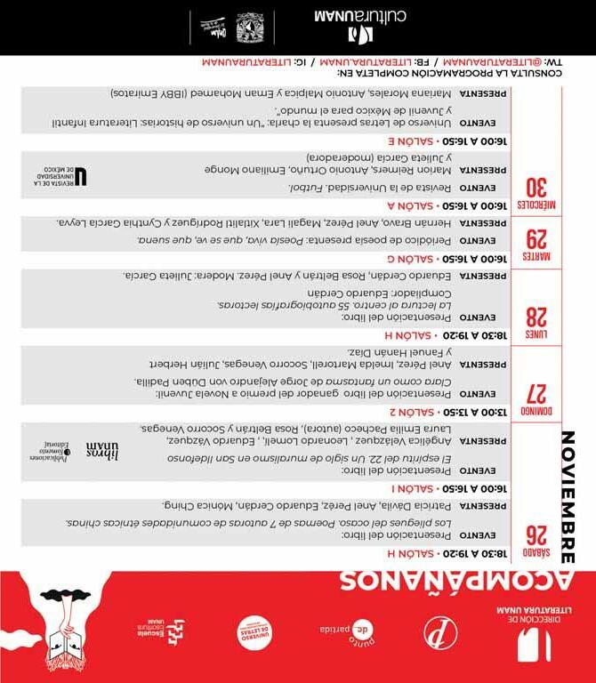 Nuestro programa 2022 está pensado para llegar a distintos públicos y ofrecer una amplia gama de actividades, temas e intereses relacionados con el libro y la lectura, además de la academia, el arte, la ciencia y el pensamiento, con grandes guras internacionales de la literatura y el conocimiento, que nos visitan desde distintos rincones del planeta.