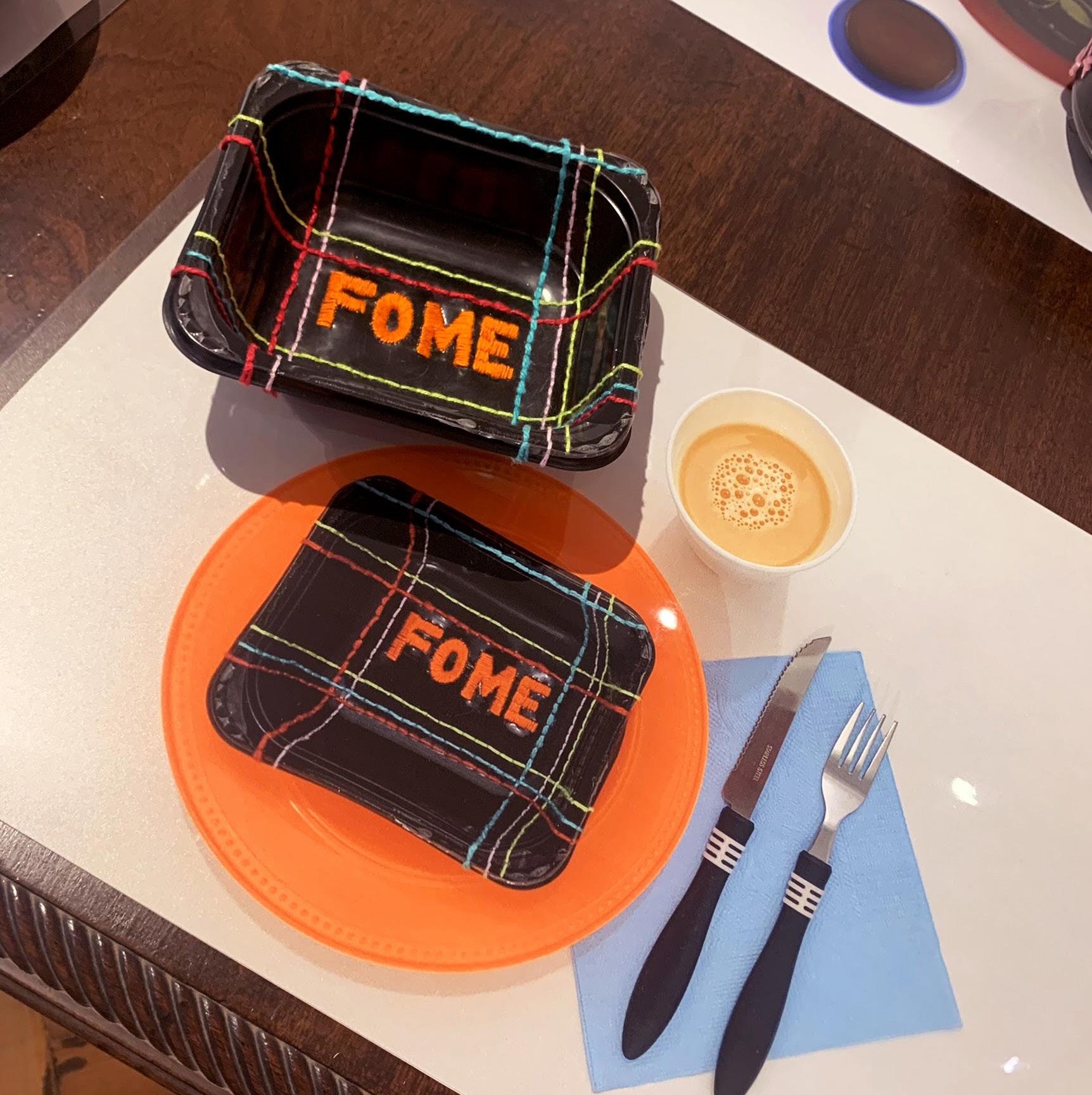 Frozen lunch boxes! (2021), 6 plastic packages embroidered with thread and photographs on a placemat printed on PVC.