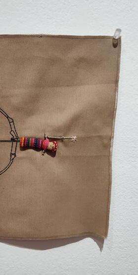 Bordado manual e industrial em lona e boneca Quitapenas.