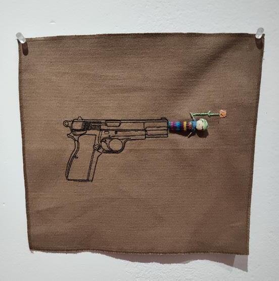 The girl who put a flower on a soldier’s rifle at a protest about the Vietnam War in Washington (USA). The young man who stood in front of an armored tank at a protest in Tiananmen Square in Beijing. Gestures of peace in moments of great tension lead the artist to the arsenal that her family kept at home during the civil war in Guatemala, her country of origin, and also to the Mayan legend of the Quitapenas, tiny guardian dolls that act as listeners, leading to the gods the concerns of those who address them with an open heart so that they can find a clearer and lighter way of resolving them. This resulted in the series of embroidered weapons that, at their points, carry a magic doll both as resistance and as ammunition for protection and peace.