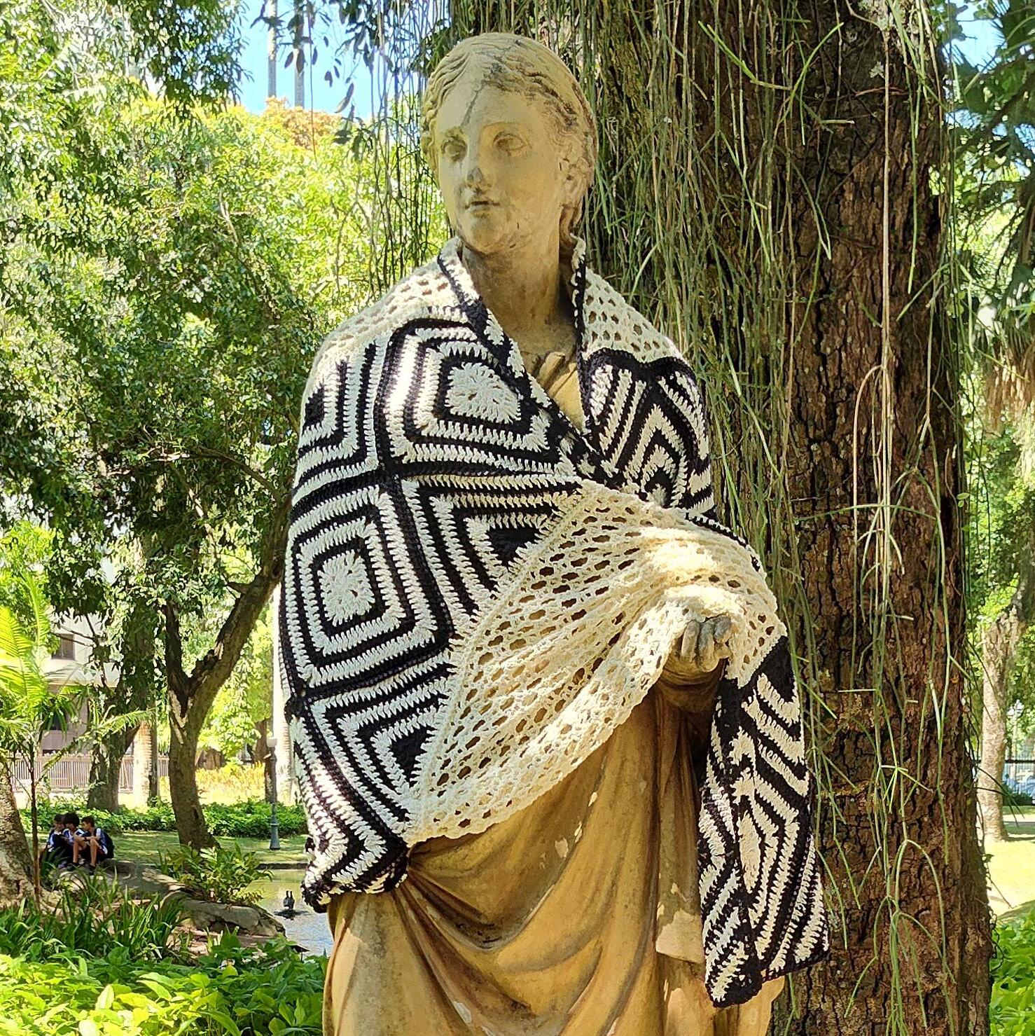 Fotografia de yarn bombing em estátua de terracota, Jardins do Palácio do Catete/RJ.