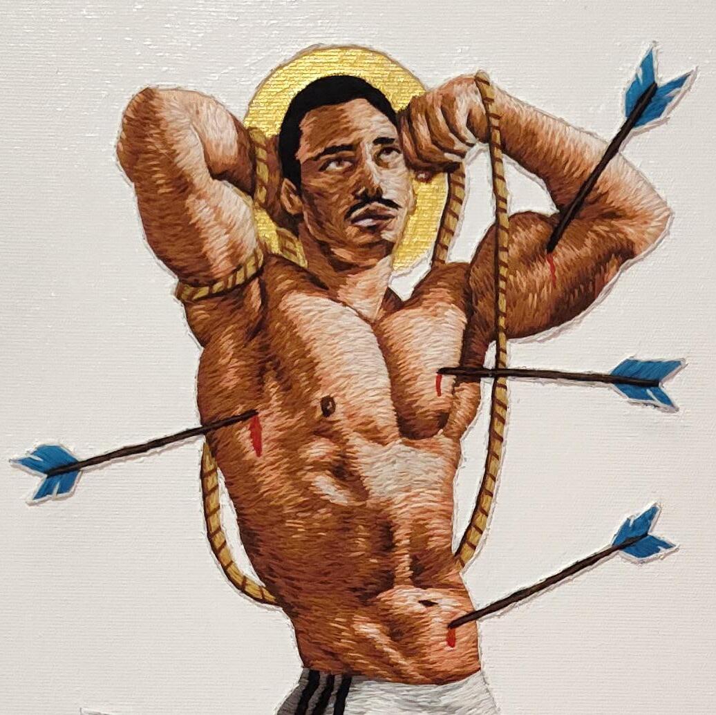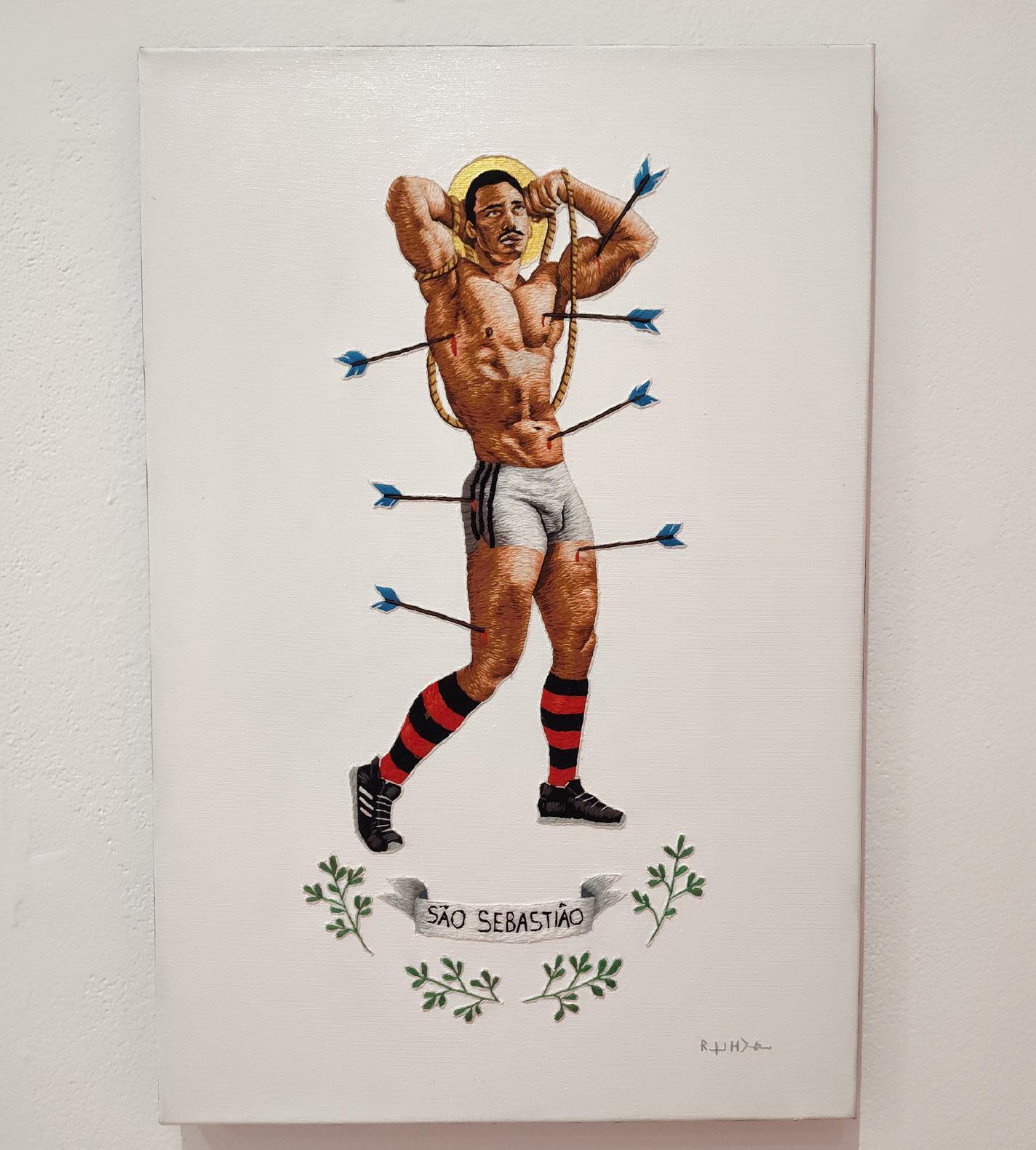 Com a “pintura de agulha”, o artista plástico Rafael Dambros (Caxias do Sul/RS) usa as múltiplas cores da linha de costura como matéria-prima do traçado sobre uma tela. Em seu São Sebastião como jogador de futebol, a agulha reflete as flechas do martírio do santo padroeiro do Rio de Janeiro, que é representado à exaustão e sincretizado no Brasil com Oxóssi, o orixá caçador das matas. A sobreposição das linhas cria camadas de luz, sombra, leituras e provocações. Surge um novo ícone brasileiro, forte, livre e cheio de contrastes: entre as representações clássicas e a iconografia pop, entre o homoerotismo e o machismo no esporte, entre o sagrado e o profano.