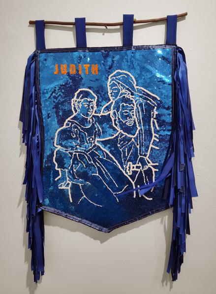 Maneater - Judith (2019), rose branch, sequins and satin ribbon on fabric.