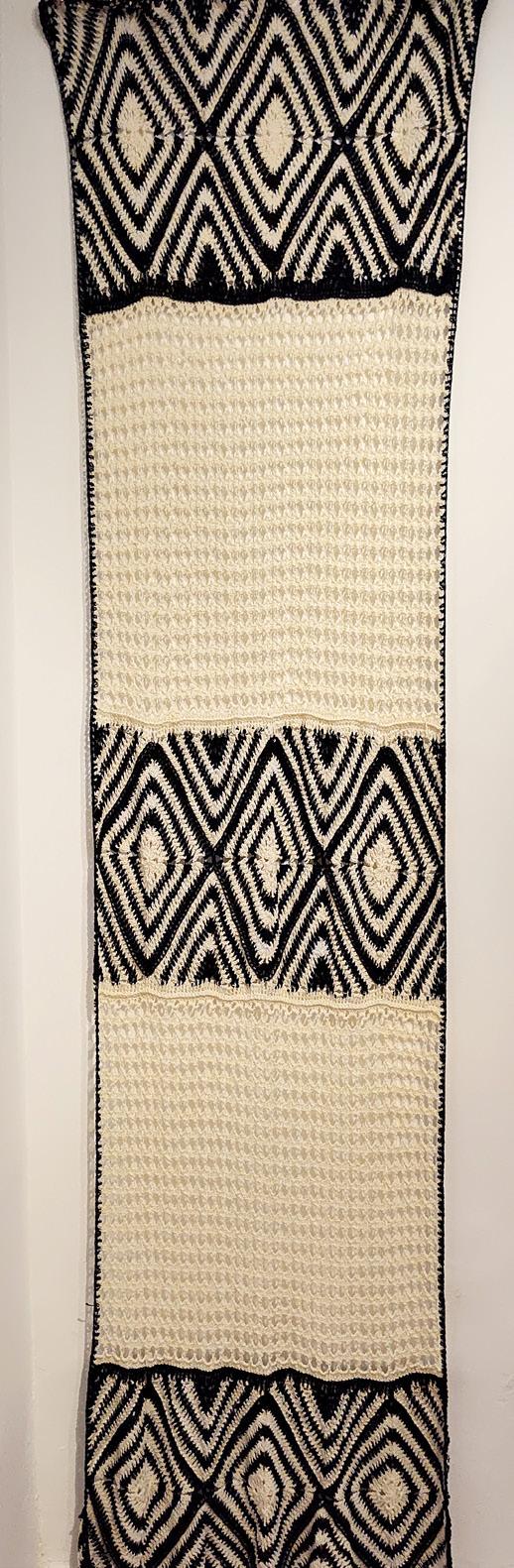 Diasporic blanket with indigenous graphics (2023), traditional cotton yarn crochet.