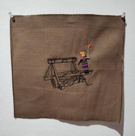Quitapenas Cannon (2023), Quitapenas Bazooka (2020), Quitapenas Pistol (2023), Quitapenas Archery (2020), Quitapenas Catapult (2023), Quitapenas CM176 (2020), manual and industrial embroidery on canvas and Quitapenas doll.
