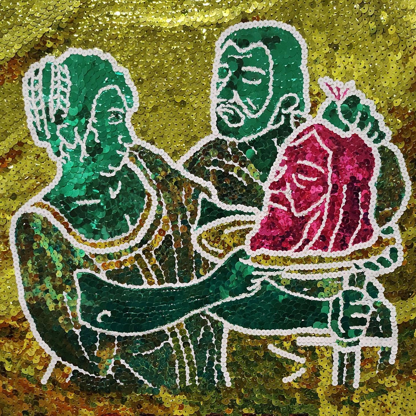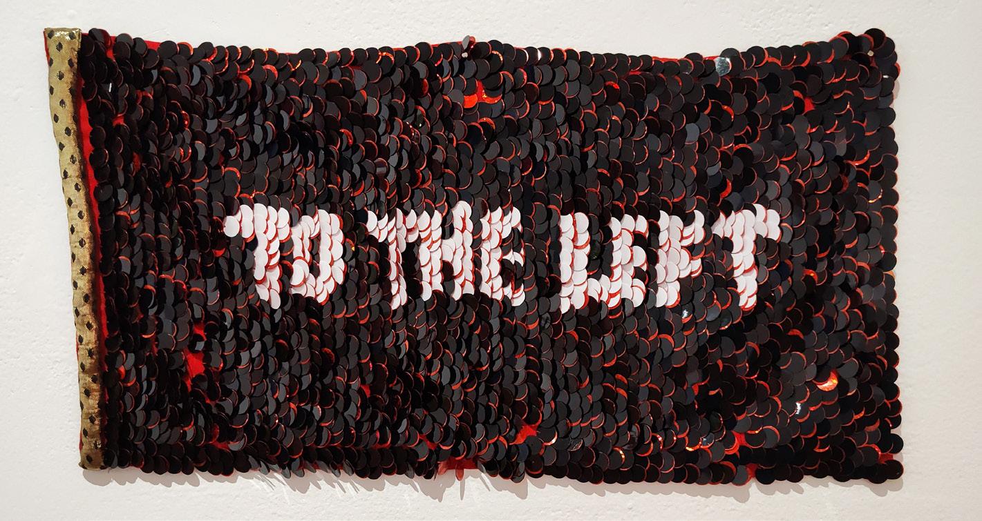 To the left (2020), acrylic paint on sequin embroidered on fabric.