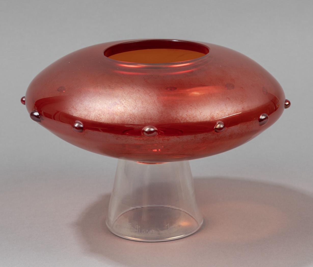 Bomboniera 1930 ca. in vetro incamiciato con avventurina e canne rosse. Produzione Venini. Firma ad acido Venini Murano.