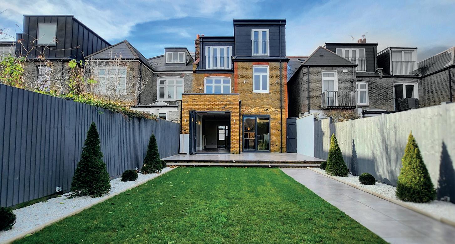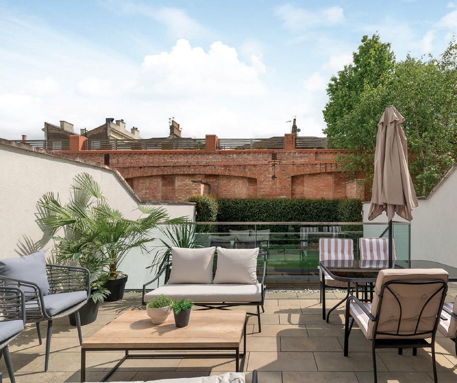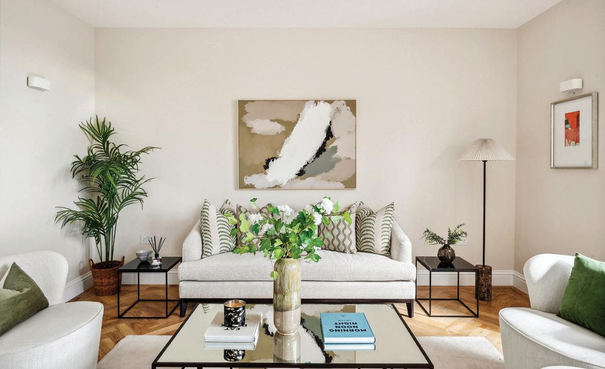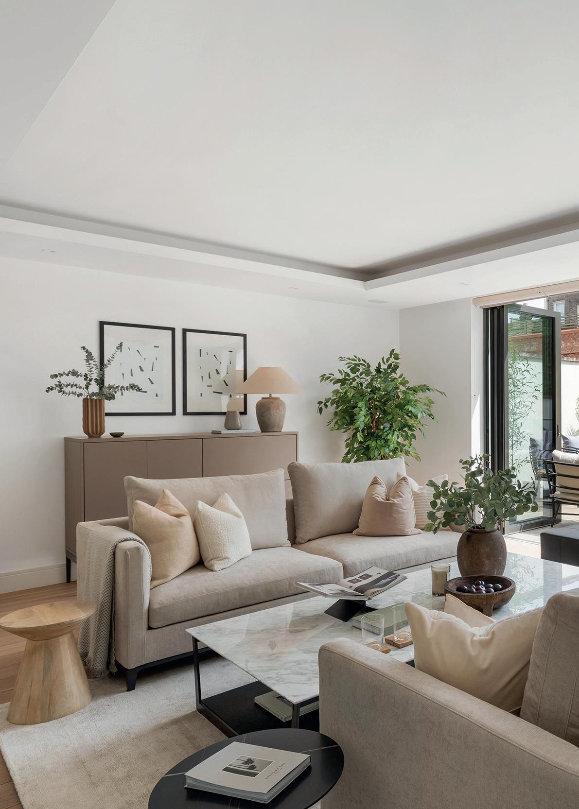 Upon entering the property, you are greeted by a stylish home office and a beautiful, formal sitting room; a space which blends luxury with practicality, with floor-toceiling bi-fold doors flooding the space with natural light, creating a seamless transition to the south-facing patio. Providing a kind of indoor-outdoor living rarely found in the capital, the private garden spaces are one of this home’s most enviable features.