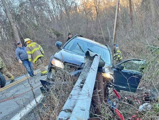 At 1515 on November30, 2024, Squad 7 was requested to respond to an MVAwith injuries on Murphys Run Road in Summit Park. Squad 7 responded with three personnel in three minutes. Engine 132 arrived at the single-vehicle accident into the guardrail with the vehicle partially overthe embankment creating an egress issue forthe sole occupant. Squad 7 arrived and placed two Rescue 42 struts in place to stabilize the vehicle with Engine 132 securing a chain to the vehicle as a tie back. Crews quickly removed the patient from the vehicle into the care of EMS. One BLS patient was transported to UHC by HCES 628.