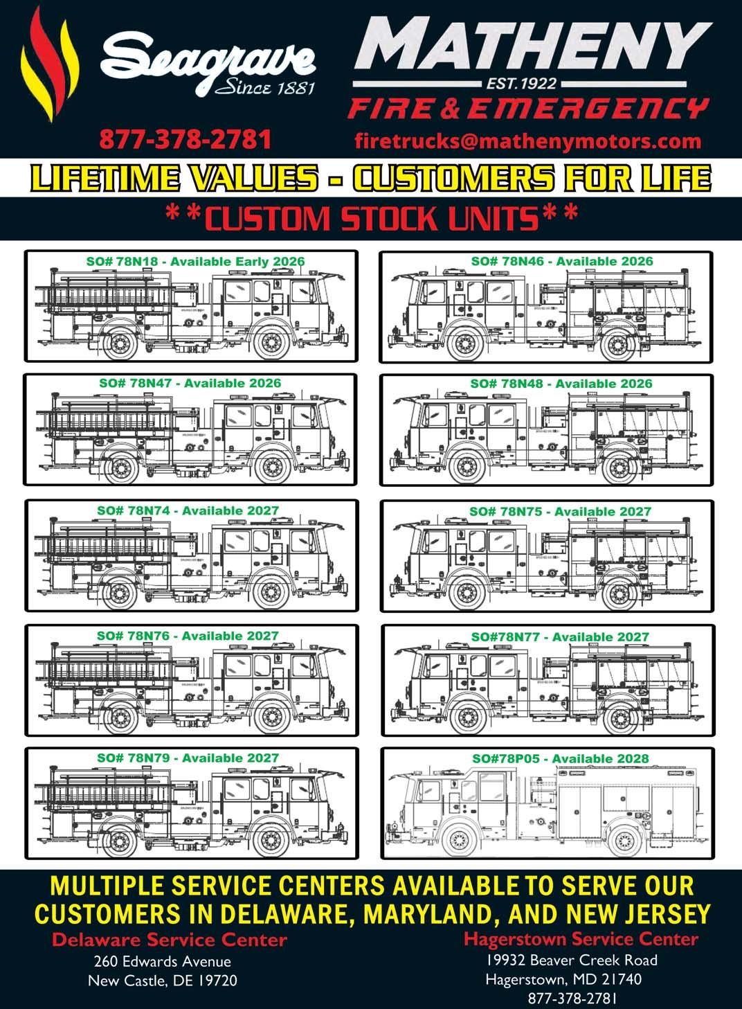 As part of this expansion, Matheny Fire & Emergency will be better positioned to provide sales and service support for Delaware, Maryland, and Southern New Jersey. This soon to be opened facility will be staffed with a service manager, parts team, and EVT/ASE certified technicians. Mobile service, technical support, training, and readily available parts shall also be available to minimize vehicle down time and keep customer fleets in service.