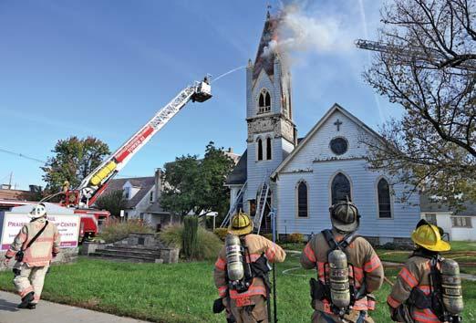 Shortly before 1000 on October14, 2024, Baltimore County fire units were alerted fora reported fire at the St. Paul Praise and Worship Centerin the 500 block of Reisterstown Road in Pikesville. Baltimore County Fire Department Engine 2 arrived to smoke showing from a multi-story church and requested the working fire dispatch assignment, followed shortly by Pikesville VolunteerFire Company Tower323. Firefighters from E 2 and TW323 initiated an interiorattack of fire on the first floorand began opening up the structure to search forextension, as the toweroperatorrepositioned the apparatus off the road at the Alpha/Bravo cornerforbetter access. Firefighters deployed multiple hoselines and supply lines as