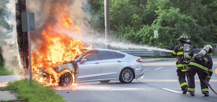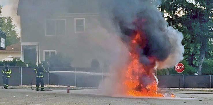A car became engulfed in flames after it crashed into a utility pole and the pole became energized from damaged power lines. The unusual crash occurred about 0600 hours on July 6, 2025, on Whitehead Road near the Trenton Freeway (Route 1) overpass in Lawrence Township. Firefighters from both Hamilton and Lawrence responded and arrived to find that the driver had already self-extricated. At that time, a small fire was burning on the pole and a priority response was requested from PSE&G. Before utility crews could arrive and de-energize the damaged power lines, however, the fire intensified and spread to the car. Firefighters could only stand by and watch the fire grow. Once power was off, they moved in with a hoseline to extinguish the blaze.