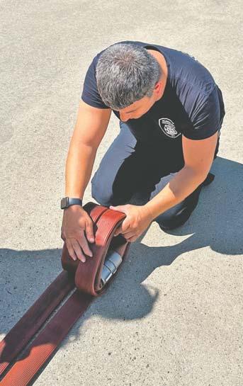 Atlantic City Airport Firefighter A.J. Berenato as he rolls hose following an MVA at Wrangleboro and Tilton roads on September 4, 2025. Notice he’s rolling a true donut roll.
