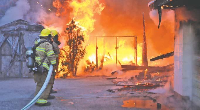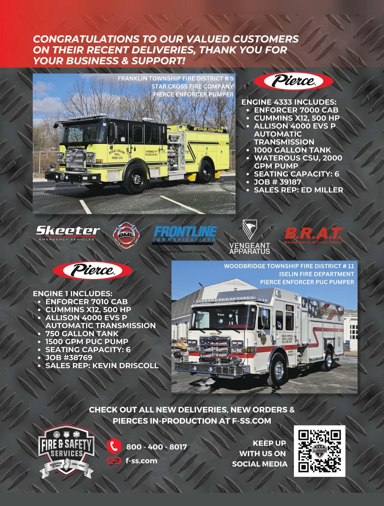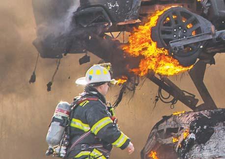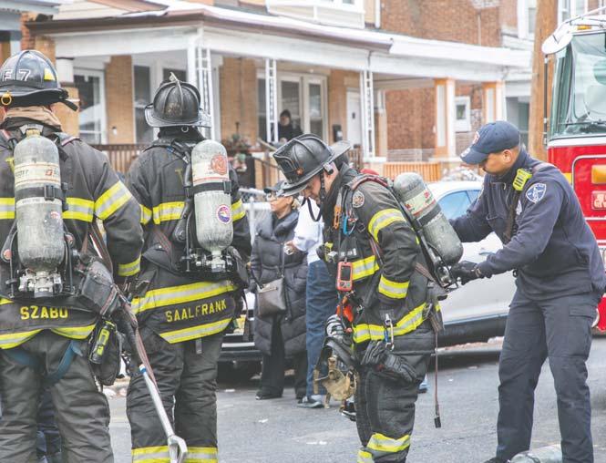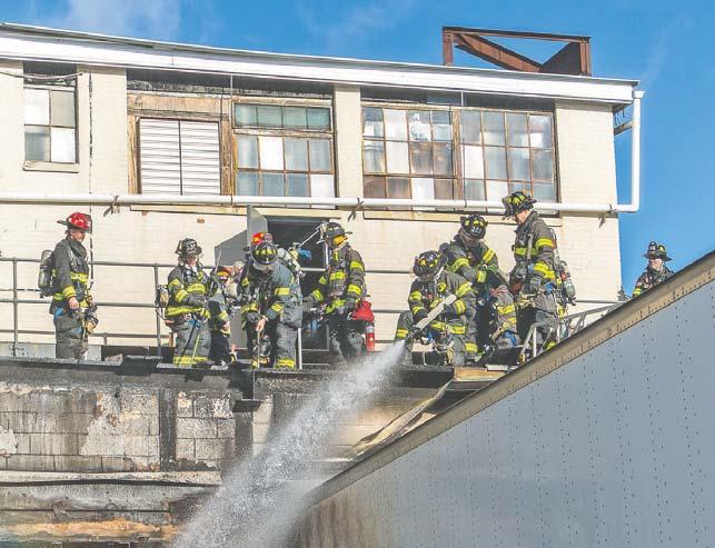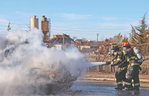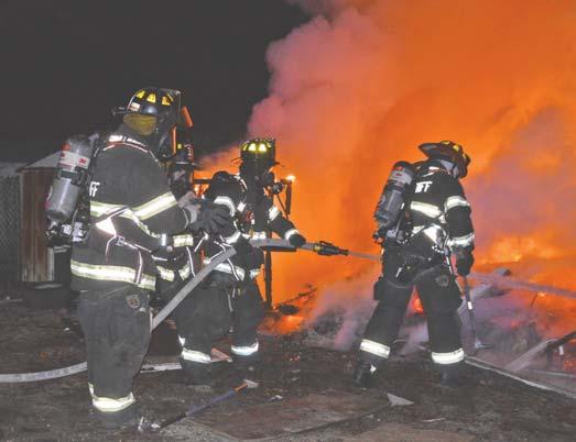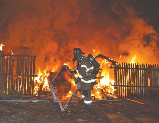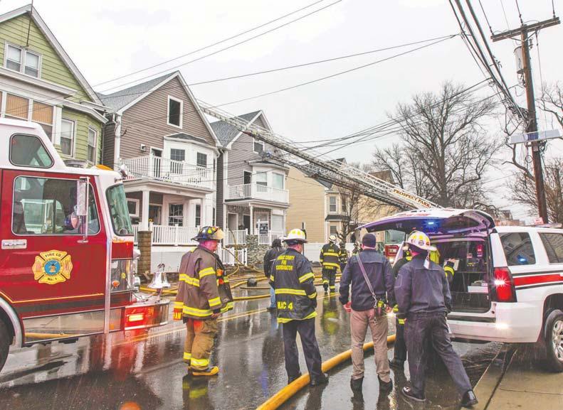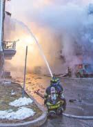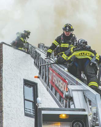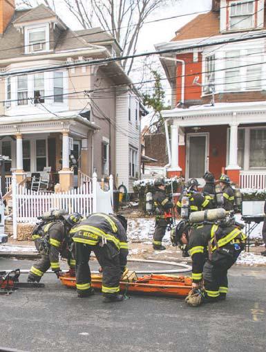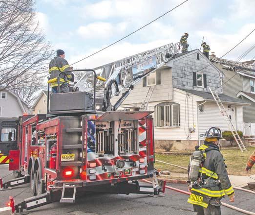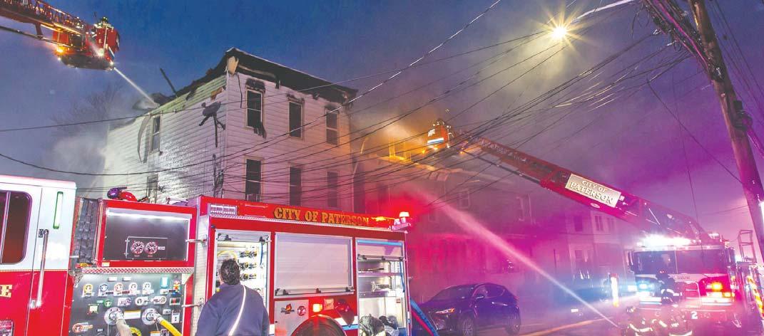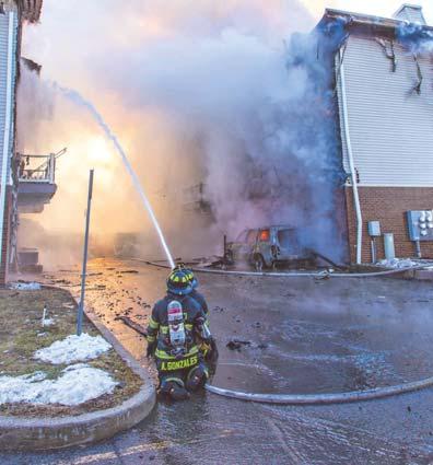 Afour-alarm fire completely destroyed two townhouse buildings in Leonia on February 14, 2025. Crews arrived to a well-advanced fire and a second alarm was immediately transmitted. The fire building was a three-story townhouse wood frame structure and the exposure building was similar. Awall of fire greeted the firefighters as did a fully involved carin the area between the two buildings. The fire had already extended into the second building, and a third alarm was transmitted as companies set up fora defensive attack on the main fire building and conducted searches of both buildings while stretching lines. Due to the amount of fire, gusty winds and