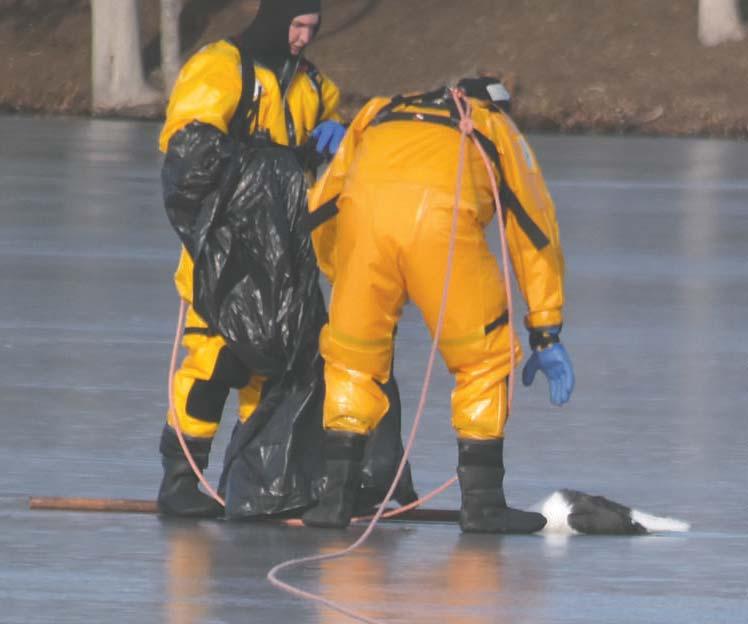 The Bargaintown VolunteerFire Company was dispatched to Bargaintown Lake on Central Avenue fora special assignment on January 30, 2025, at 1436. It was reported that a dead bald eagle was lying on the frozen lake and Bargaintown was requested to send its waterrecovery team to remove the bird. Bargaintown Chief Eugene Sharpe arrived, established command, and requested a response from the City of Linwood Fire Department, as part of the lake is located in Linwood. Both departments suited up a memberin cold watergearand both ventured out onto the ice, removed the bird, and returned to shore, where the bird was turned overto a wildlife resource officer.